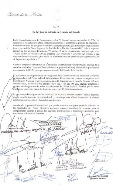 El texto lleva la firma de casi todos los miembros de la bancada que lideran el formoseño y Juliana di Tullio, bajo el título «No hay juez de la Corte sin acuerdo del Senado». En uno de los despachos de ese interbloque dijeron a LPO que «los 33 se comprometieron a rechazar el pliego».