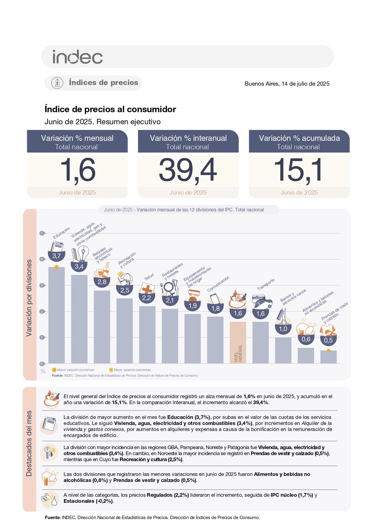La inflación mensual se deselera pero no todo lo deseado, porque sigue habiendo incrementos persistentes en sectores clave. El Índice de Precios al Consumidor (IPC) nacional subió 1,6% en junio de 2025, informó el Indec. El dato representa un leve aumento respecto de mayo (ese mes fue del 1,5%) y se inscribe dentro de una variación acumulada del 15,1% en lo que va del año y una inflación interanual del 39,4%, es decir en comparación con el mismo mes del año pasado.