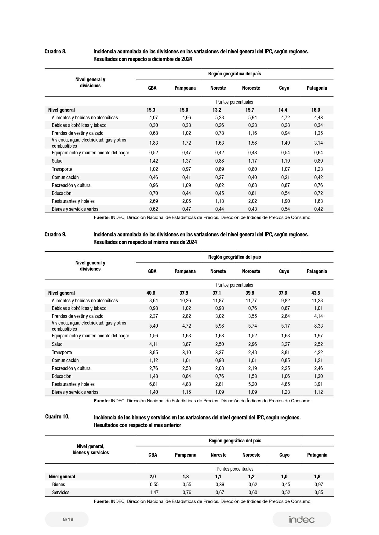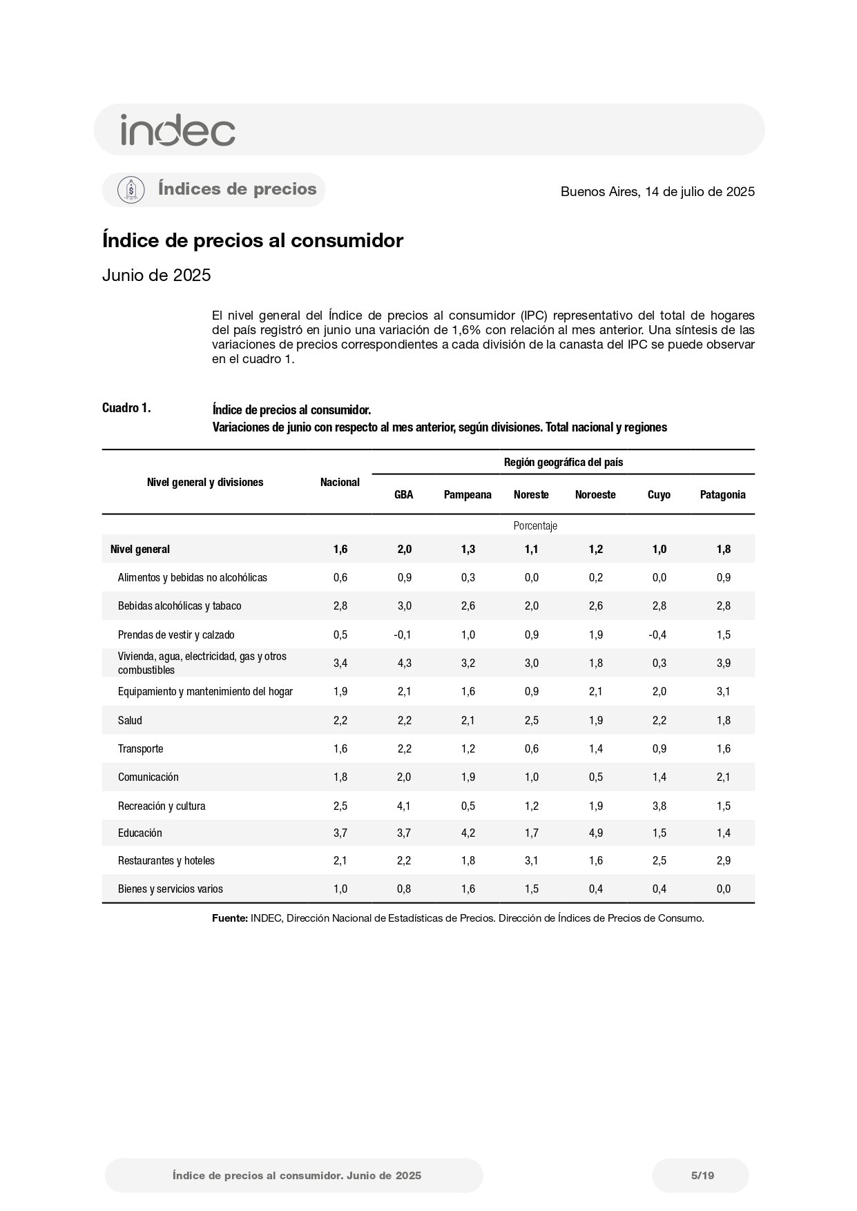 De acuerdo con el último informe del Indec, las diferencias entre regiones también resultaron significativas. La Patagonia (1,8%) y GBA (2%) fueron las áreas con mayor aumento mensual, mientras que Cuyo (1%) y el Noroeste (1,1%) mostraron las menores subas. En Cuyo, Recreación y cultura (2,5%) encabezó la variación, mientras que en el Noroeste fueron las prendas de vestir las que más incidieron.