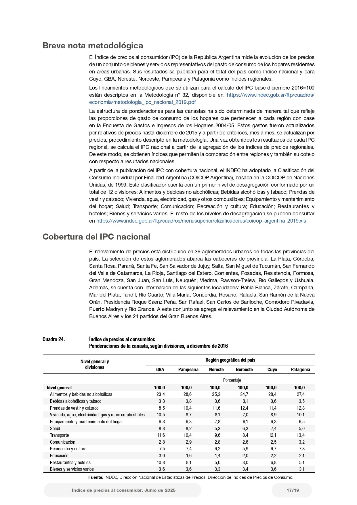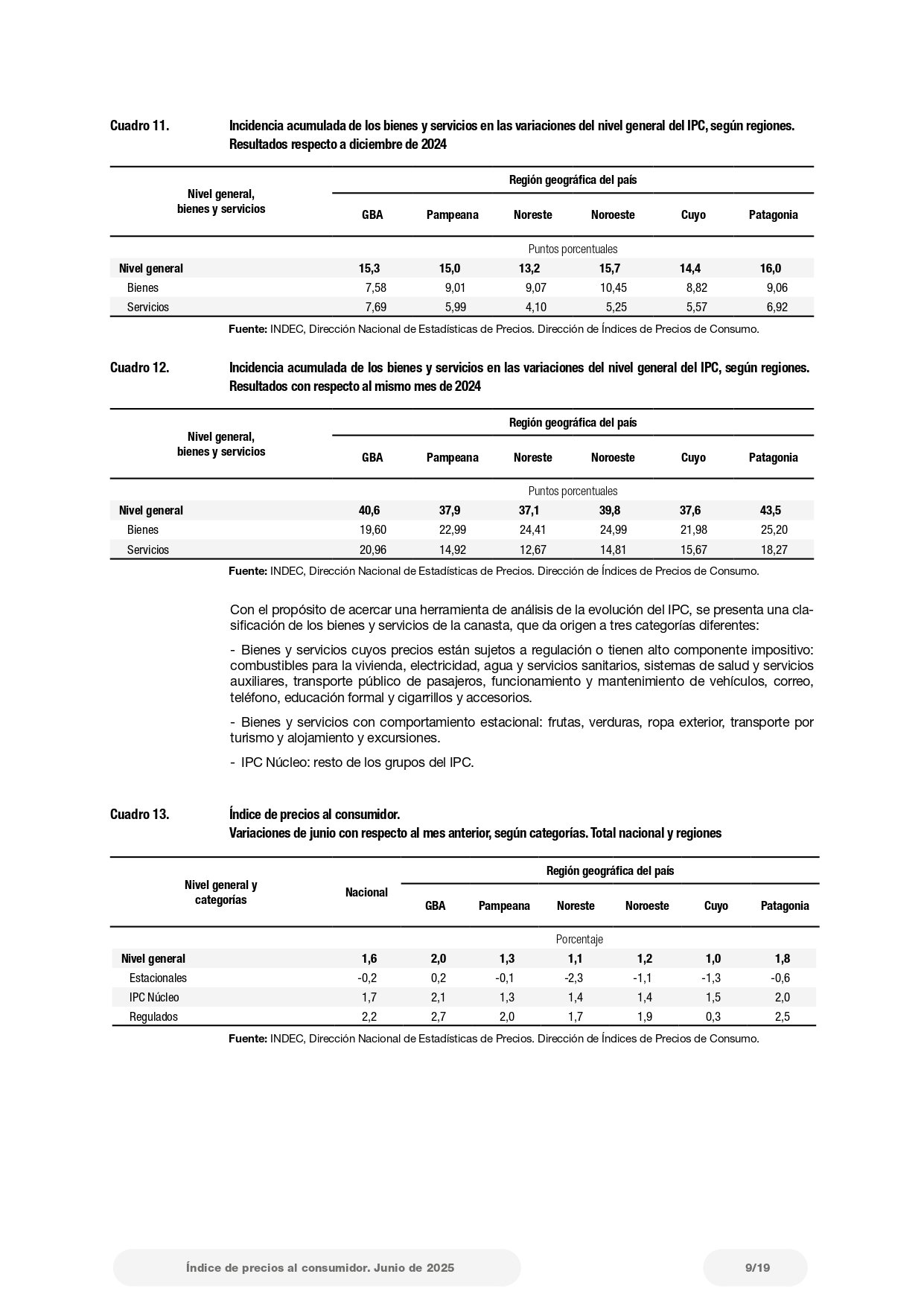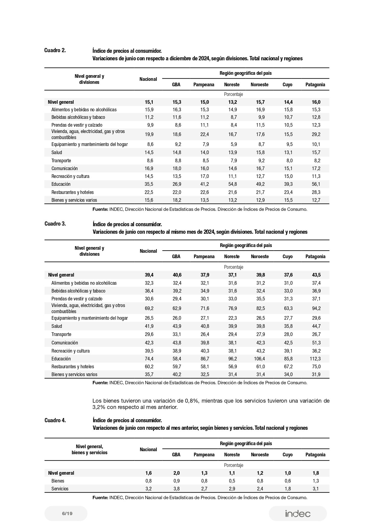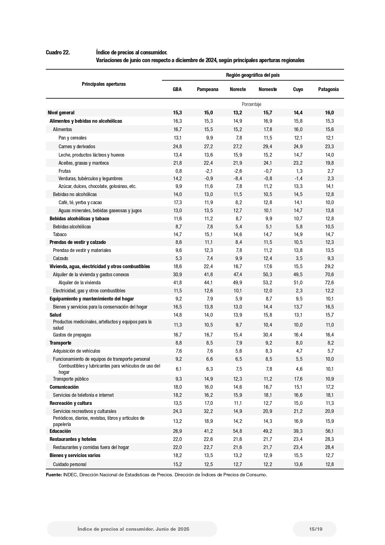 En el Cuadro 21 del informe, que detalla las “Variaciones de junio con respecto al mes anterior, según principales aperturas regionales”, se indica que el ítem “Alquiler de la vivienda y gastos conexos” subió 8,7% en la región Patagonia, lo que representa el mayor aumento regional dentro de esa categoría. Le siguen el Noroeste con 8,5%, el Noreste con 8,2%, Cuyo con 5,8%, Pampeana con 6,8% y GBA con 7,3%.