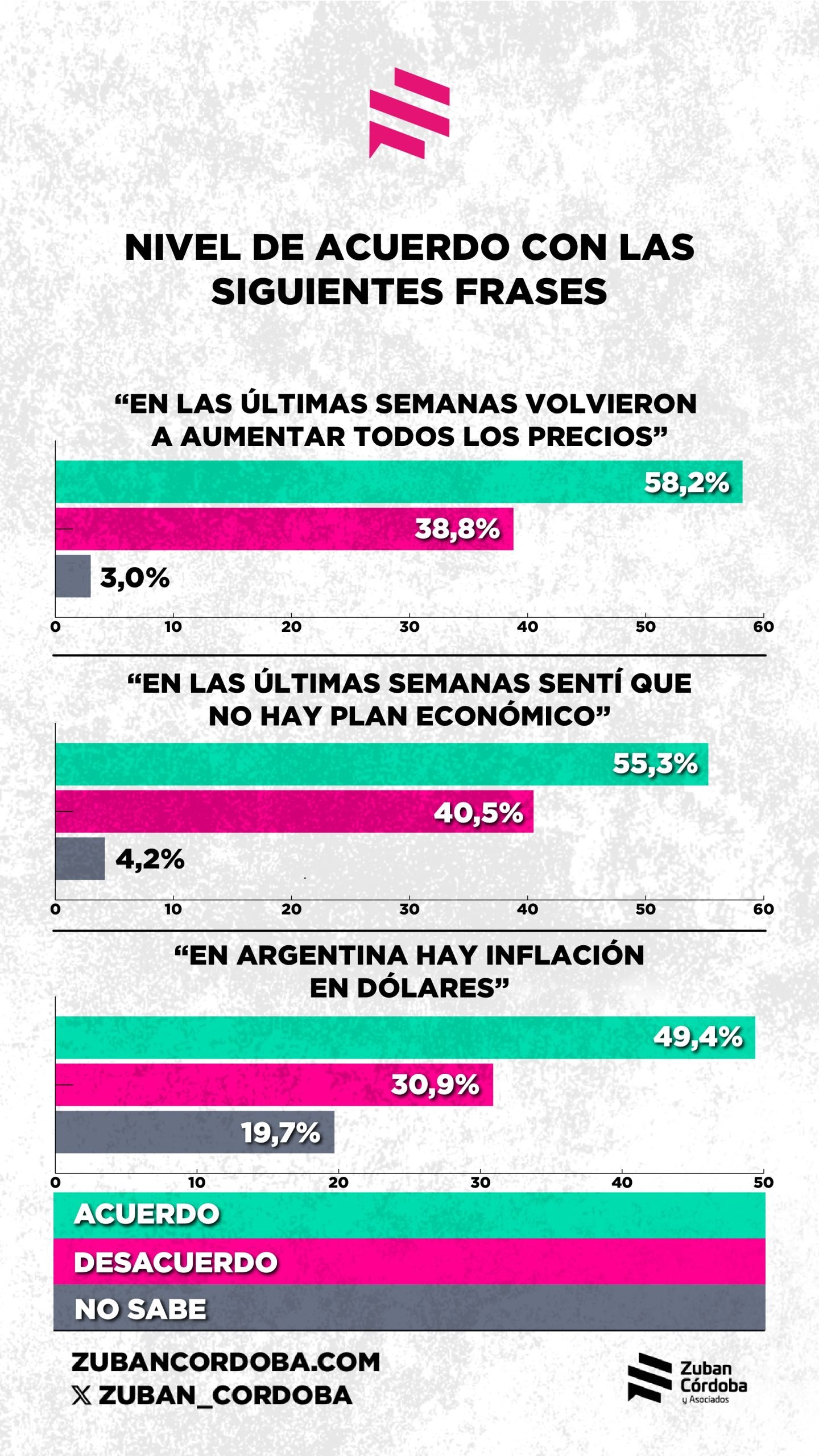 Luego preguntaron por la adhesión a una serie de afirmaciones. “En las últimas semanas sentí que no hay plan económico” obtuvo un 55 por ciento de adhesiones; “En Argentina hay inflación en dólares” fue considerada cierta por el 49 por ciento. Por otra parte, la frase “Javier Milei y el Toto Caputo tienen todo bajo control” fue considerada errónea por el 57 por ciento.