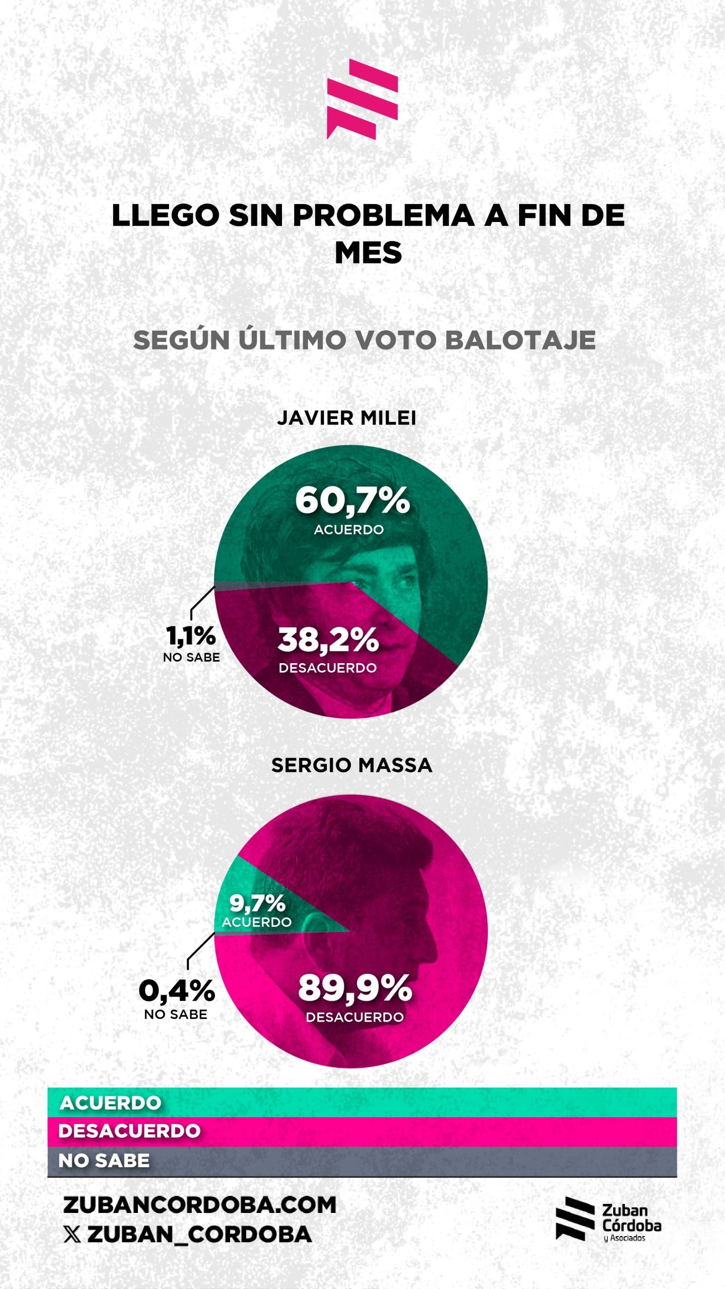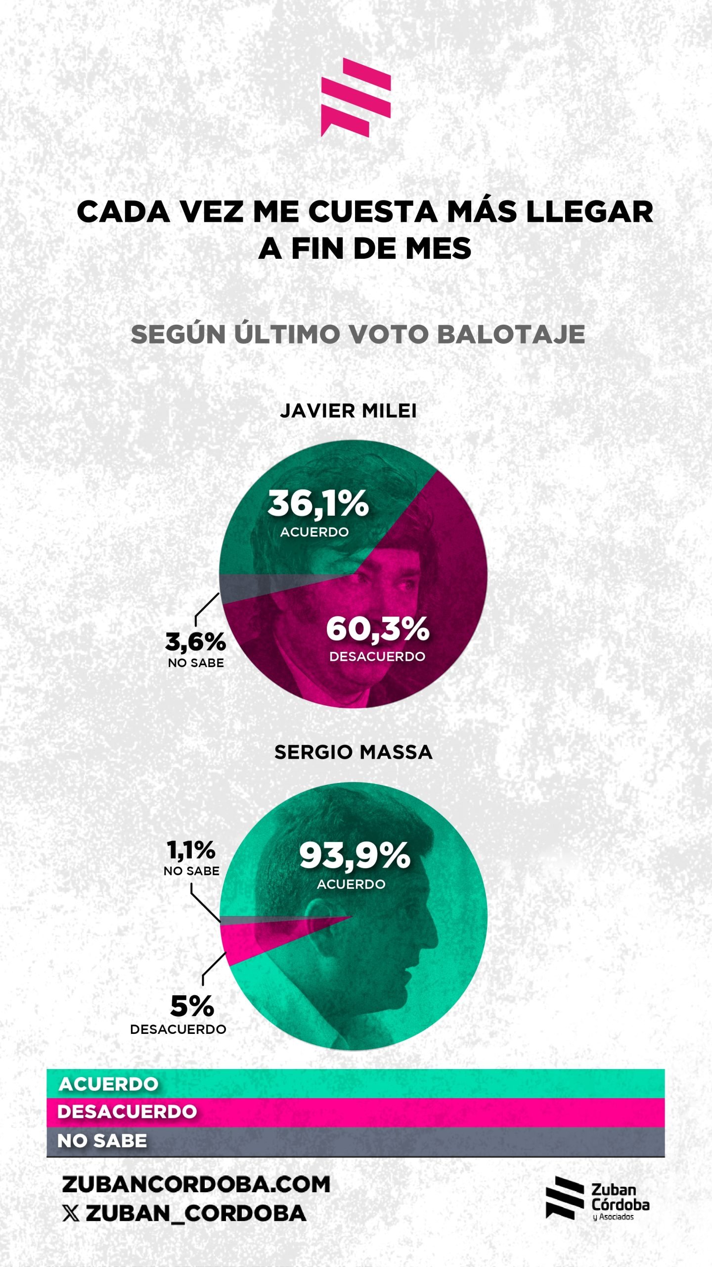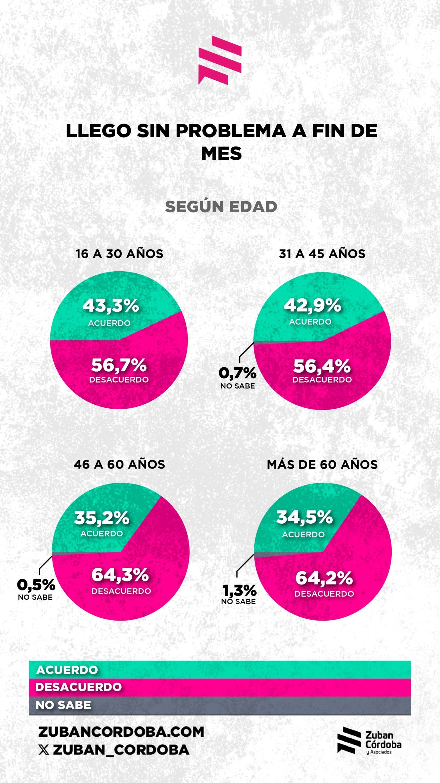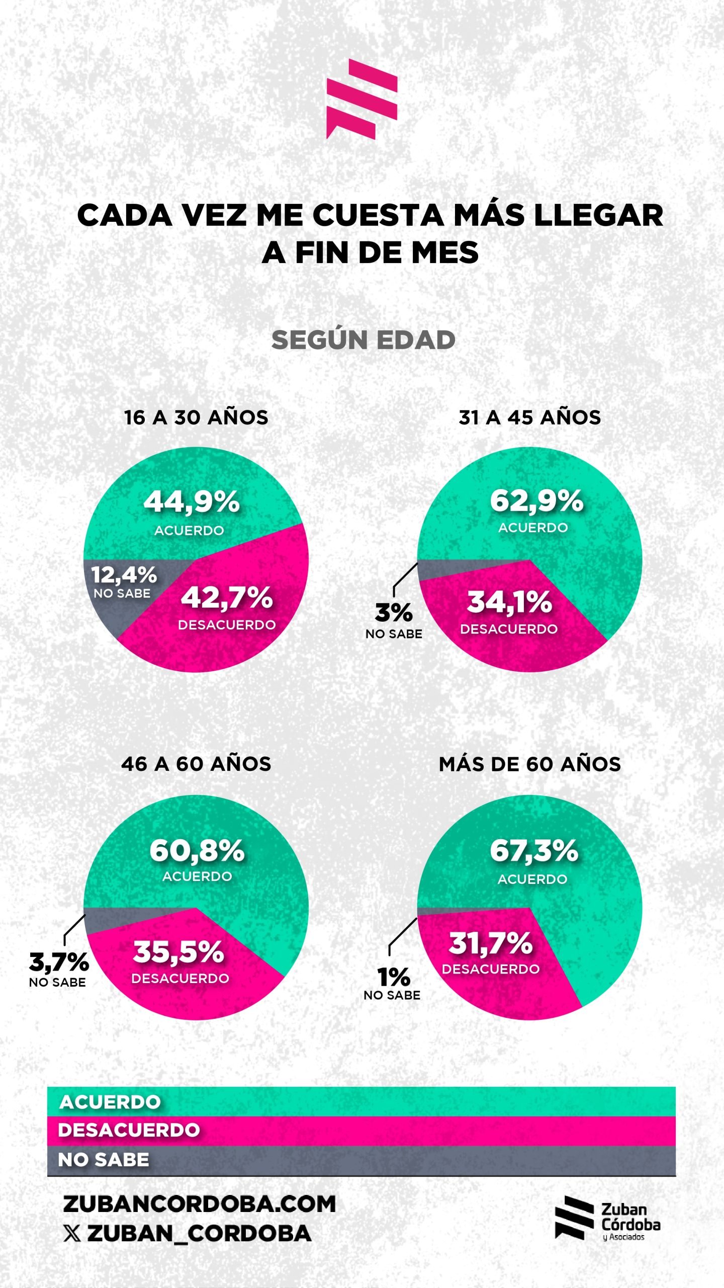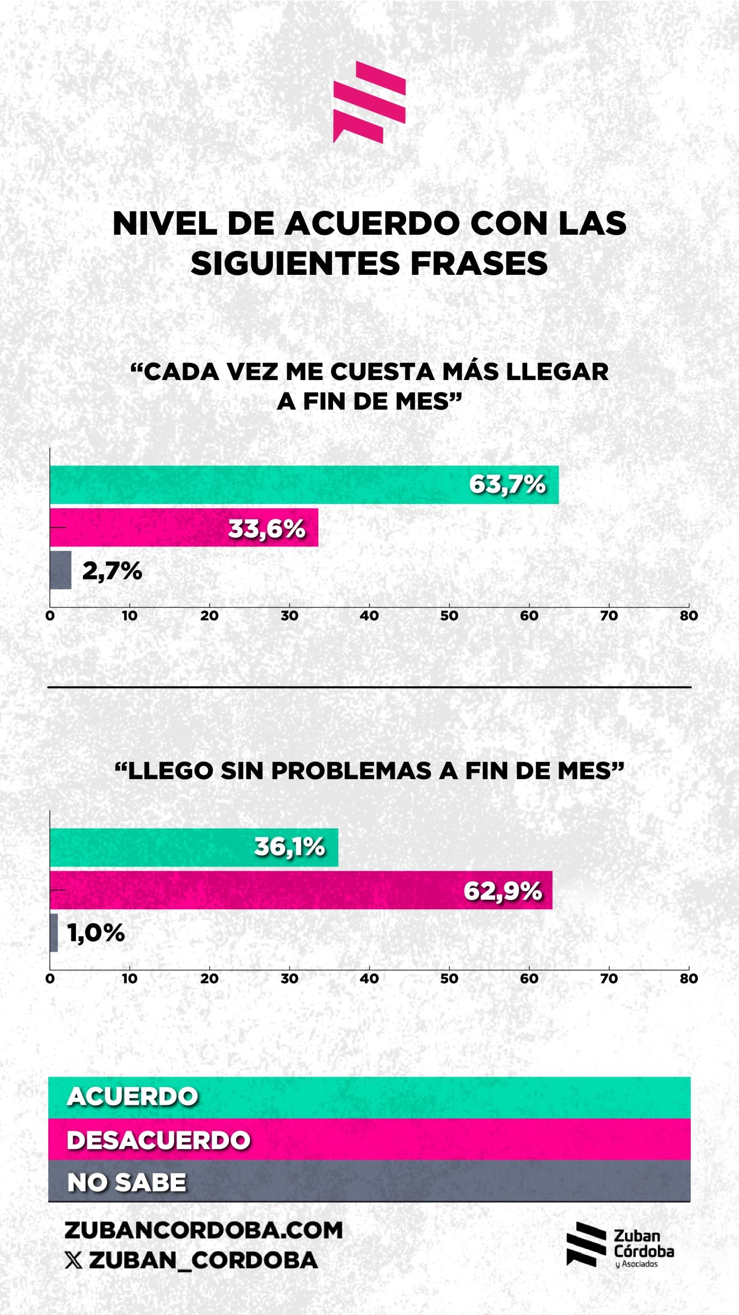 Una encuesta de la consultora Zuban Córdoba indica que, a pesar de que la inflación está relativamente controlada, el 63 por ciento de la gente siente que cada vez le cuesta más llegar a fin de mes y al 54 por ciento el dinero no le alcanza para cubrir sus necesidades básicas. “El bolsillo es el nuevo termómetro del descontento”, señala la consultora, que encontró que el 57 por ciento de los encuestados desaprobaron la gestión del gobierno.