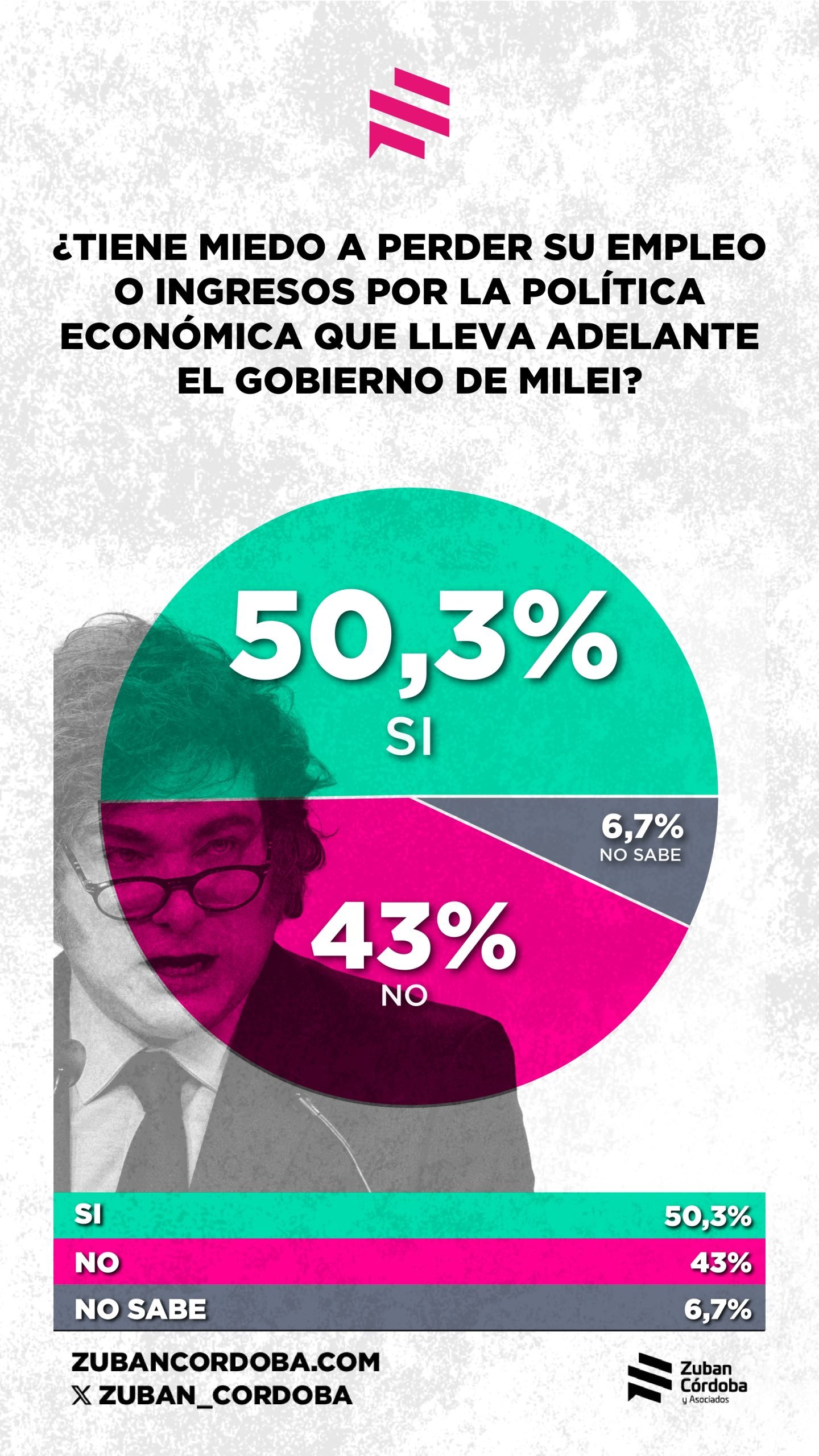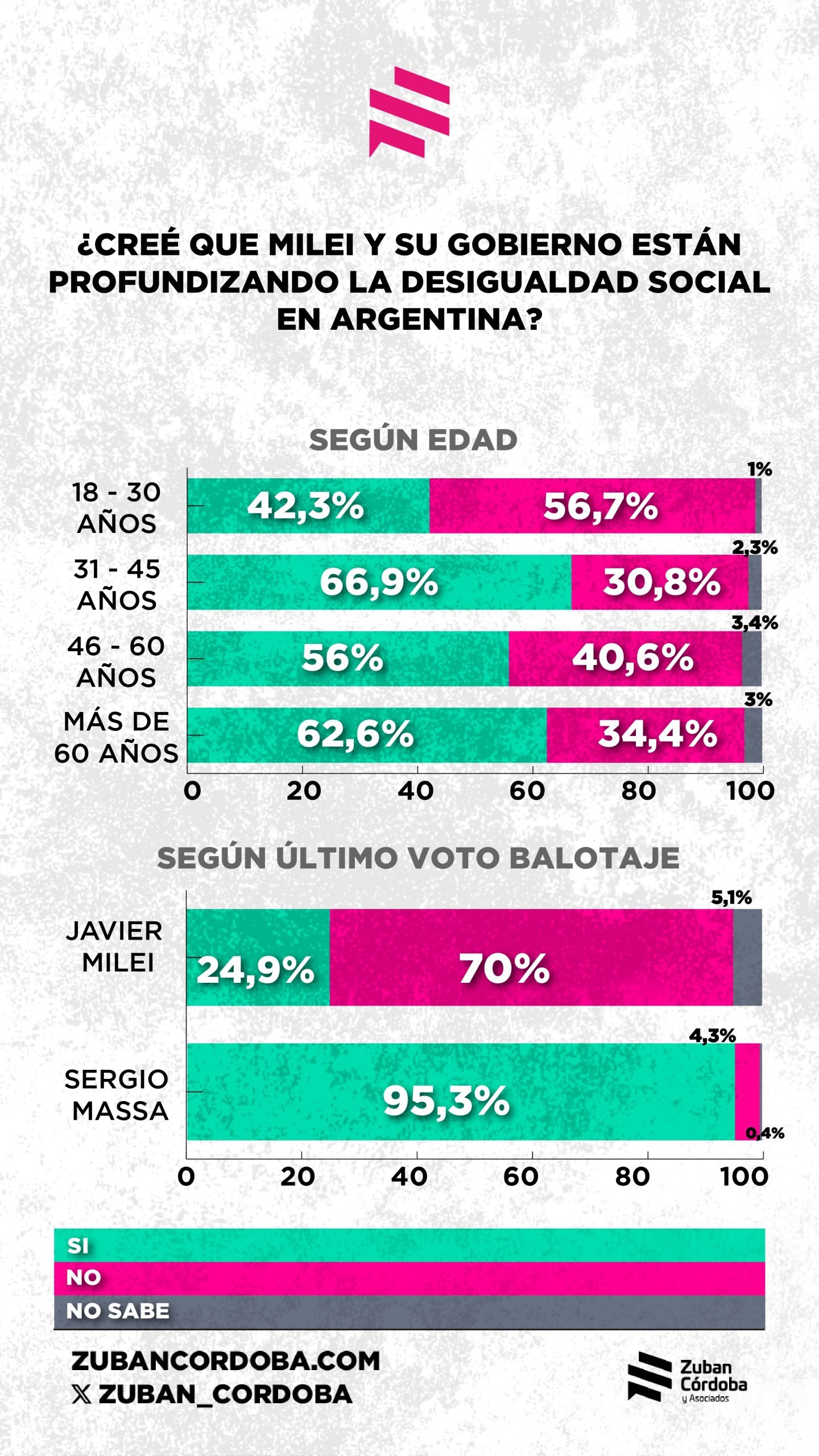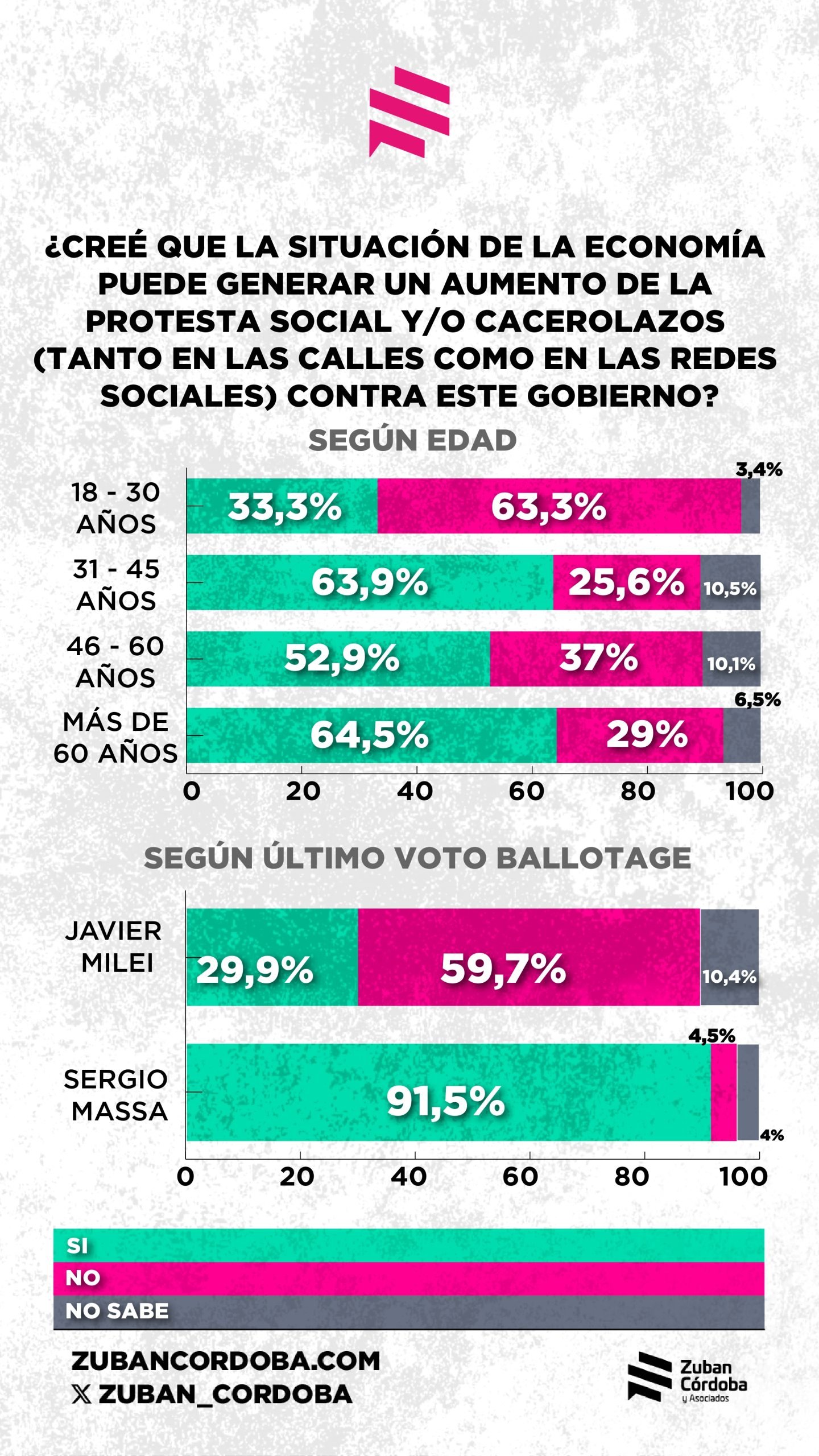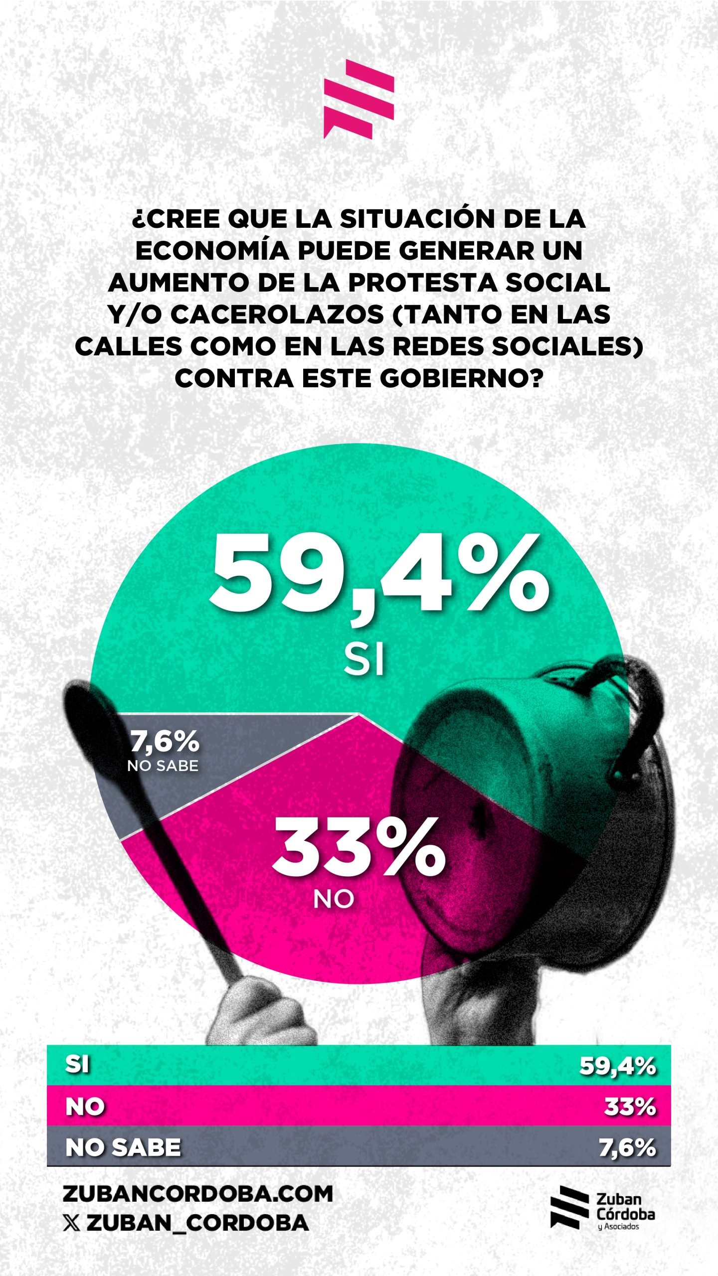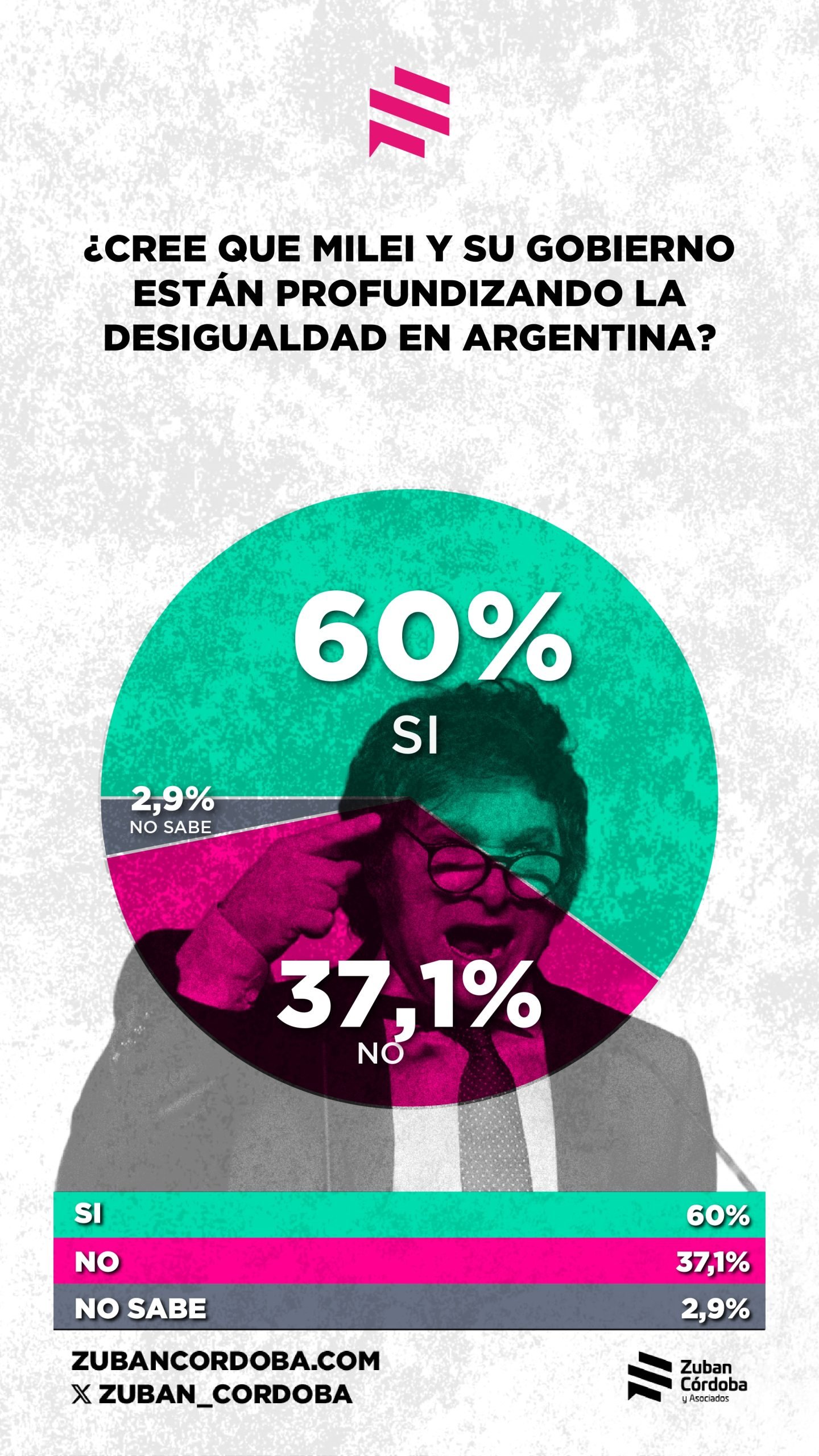 El sondeo fue realizado el 16 y 17 de julio en base a 1400 casos, y empieza a medir el clima social a medida que se acercan las elecciones bonaerenses (en setiembre) y las de legisladores nacionales (en octubre). Sus datos principales hablan de la preocupación de los argentinos por sus ingresos. “Esto no es sólo un síntoma económico, es una señal política (…) Los datos muestran que quizás, y solo quizás, el relato del ajuste virtuoso está agotando su crédito simbólico: el 64,8% cree que Milei está profundizando la desigualdad social, y un 58,3% considera probable que el malestar económico escale a protestas sociales o cacerolazos”, sostuvo Zuban Córdoba.