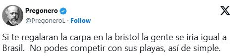 Y agregó: «Estoy seguro que tiene que ver con los trolls del oficialismo, más siendo un destino de la pecaminosa provincia de Buenos Aires».