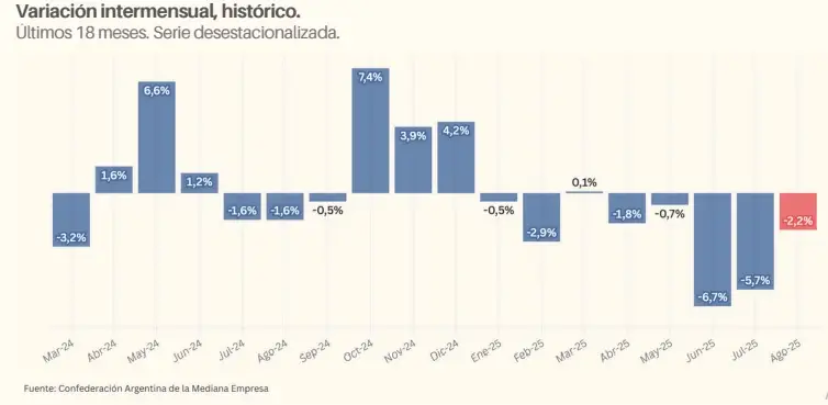 Las ventas minoristas de las pymes marcaron un retroceso en la medición interanual con una baja del 2,6% en agosto. Comparado con el mes anterior, el descenso fue del 2,2% y van cinco meses al hilo con balances negativos. Respecto a la economía de los comercios, según selaló un informe de la Confederación Argentina de la Mediana Empresa (CAME), el 55% indicó que se mantuvo en comparación al año anterior, mientras que un 35% (5 puntos porcentuales más que el mes anterior) afirmó que empeoró.