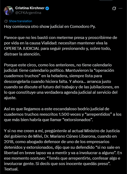 La expresidenta denunció que «hoy comienza otro show judicial en Comodoro Py». Dijo que la “operación cuadernos truchos” estaba «en la heladera, siempre lista para descongelarla cuando hiciera falta» y resurge ahora «justo cuando se discute el futuro del trabajo y de las jubilaciones».