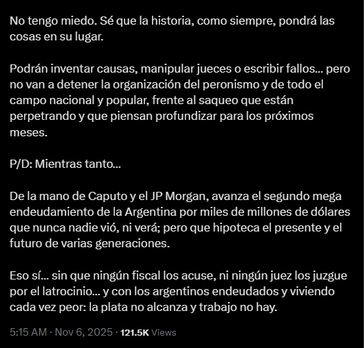 «Parece que no les bastó con meterme presa y proscribirme de por vida en la causa Vialidad: necesitan mantener viva la OPERETA JUDICIAL para seguir presionando y, sobre todo, distraer la atención”, escribió la exmandataria en su cuenta de X.