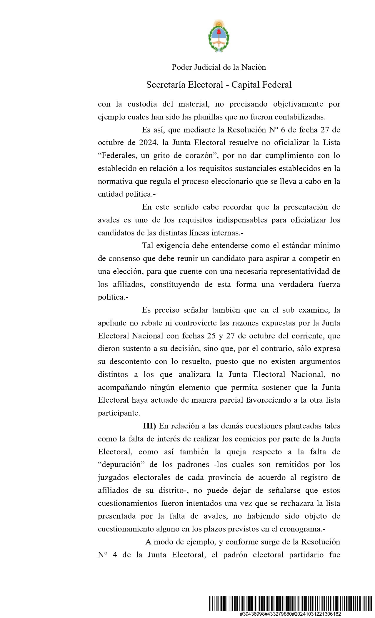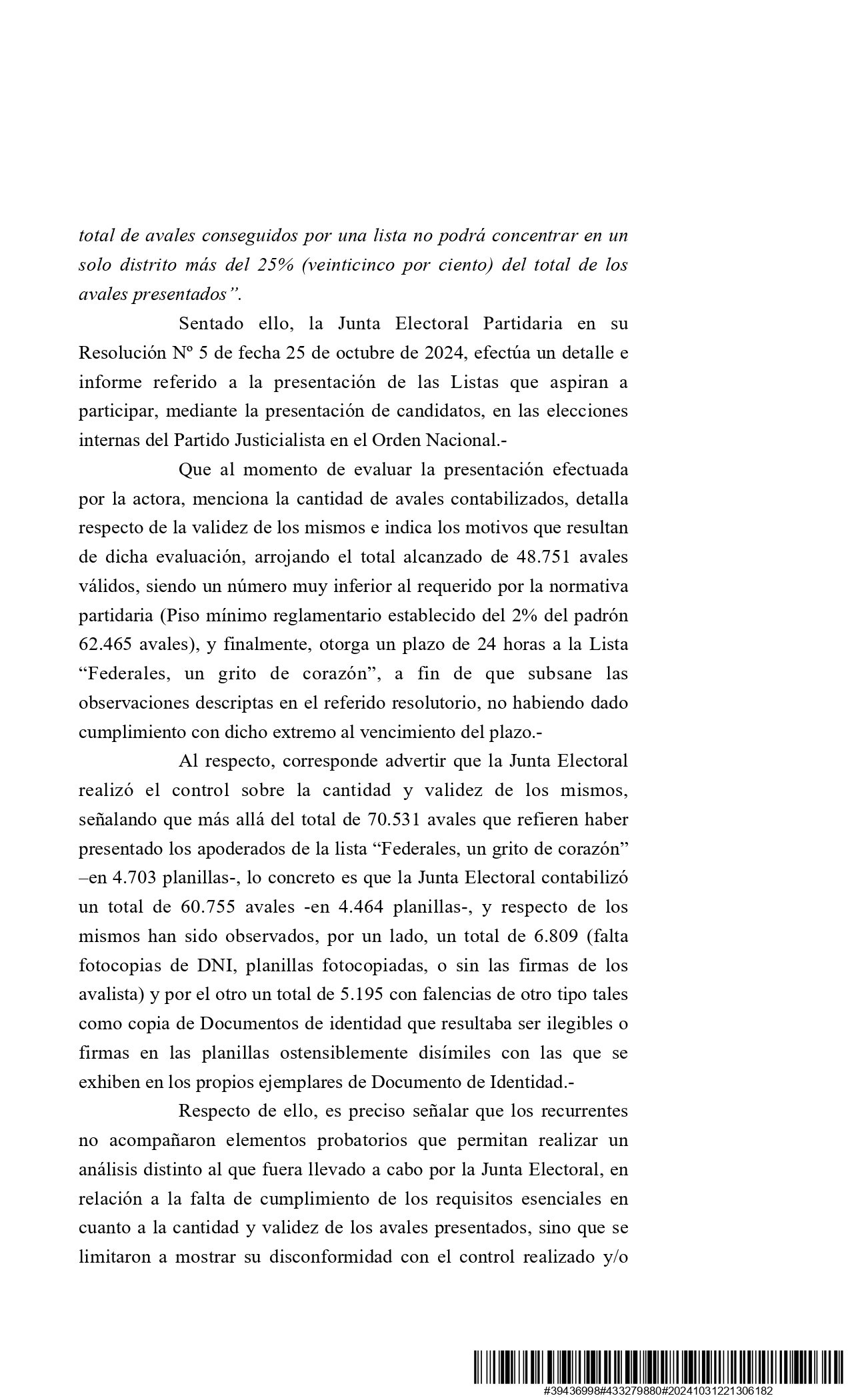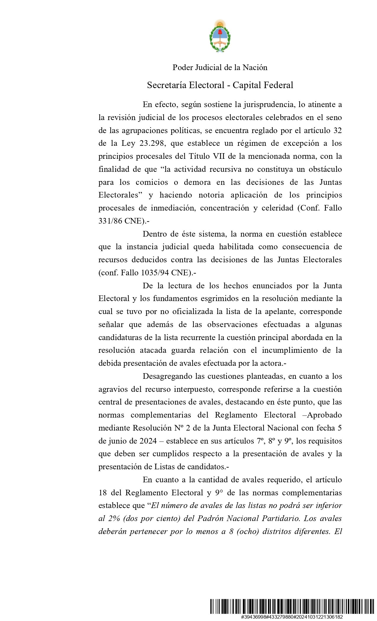 El texto del fallo de Servini dice que tras una evaluación de «los hechos enunciados por la Junta Electoral y los fundamentos esgrimidos en la resolución mediante la cual se tuvo por no oficializada la lista de la apelante, corresponde señalar que además de las observaciones efectuadas a algunas candidaturas de la lista recurrente la cuestión principal abordada en la resolución atacada guarda relación con el incumplimiento de la debida presentación de avales efectuada por la actora».