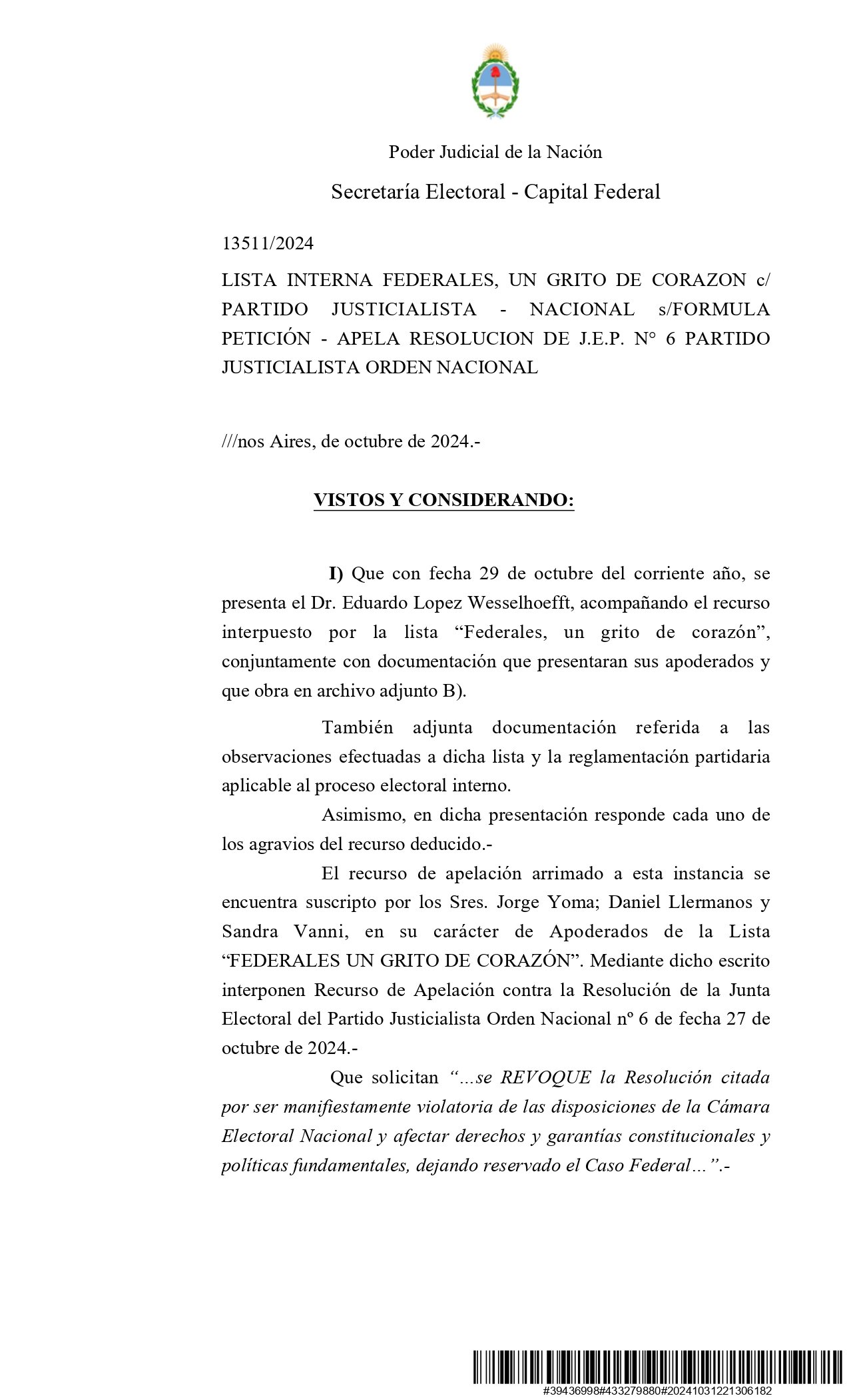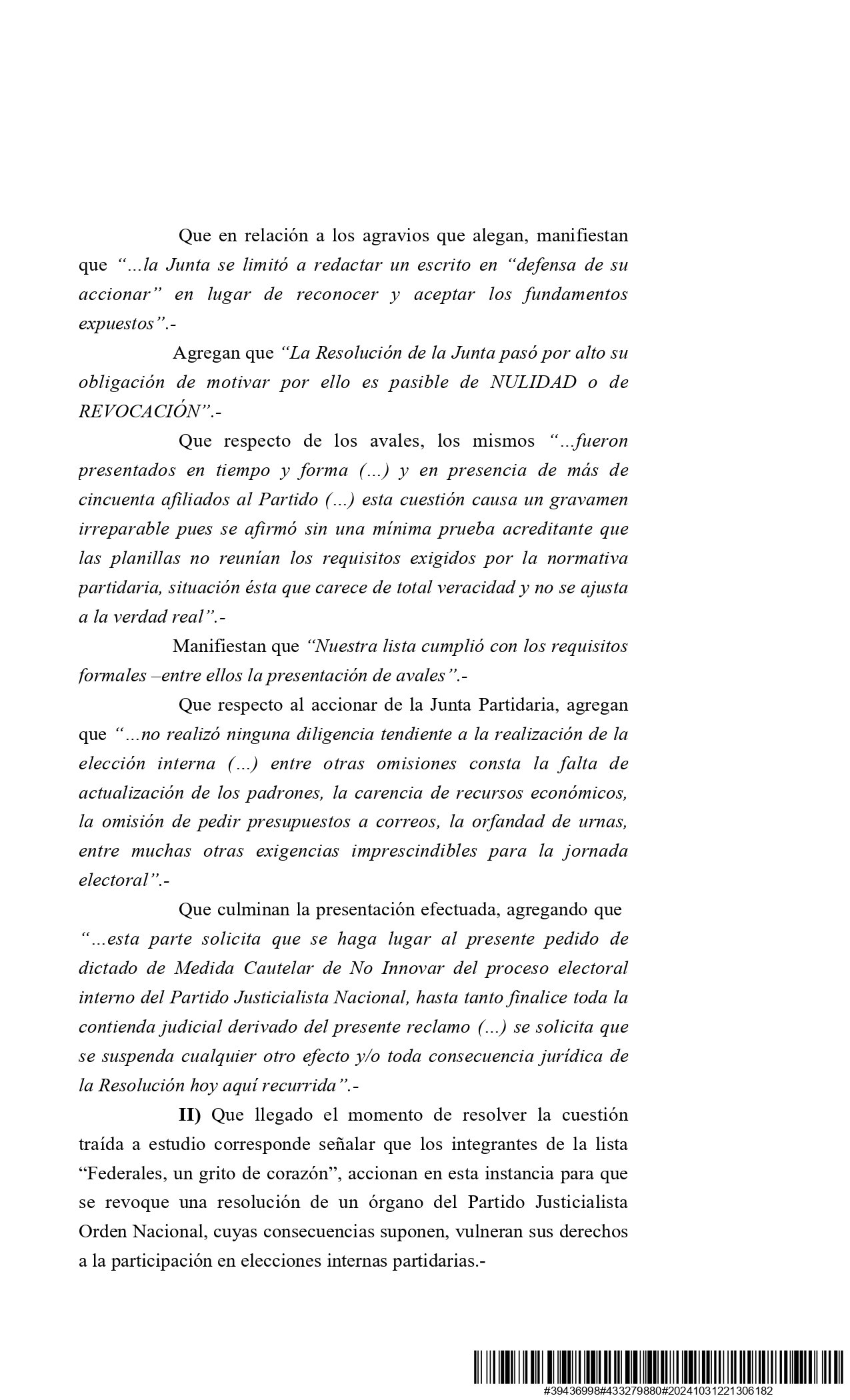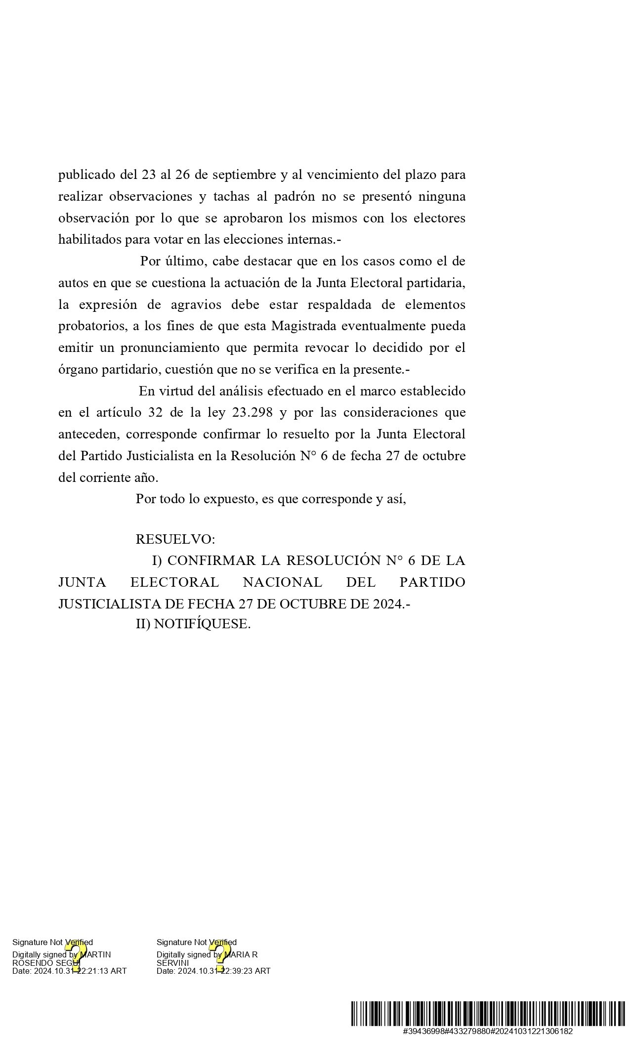 El texto del fallo de Servini dice que tras una evaluación de «los hechos enunciados por la Junta Electoral y los fundamentos esgrimidos en la resolución mediante la cual se tuvo por no oficializada la lista de la apelante, corresponde señalar que además de las observaciones efectuadas a algunas candidaturas de la lista recurrente la cuestión principal abordada en la resolución atacada guarda relación con el incumplimiento de la debida presentación de avales efectuada por la actora».