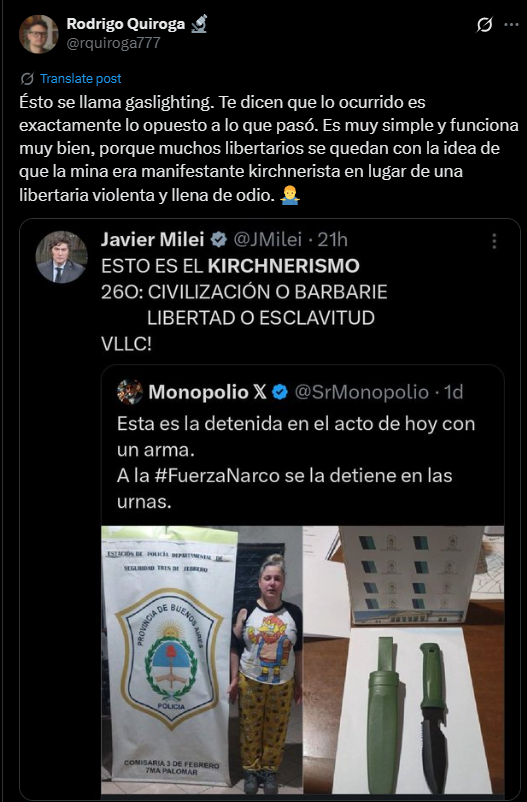 Así lo explica Rodrigo Quiroga, de la Universidad Nacional de Córdoba: «Te dicen que lo ocurrido es exactamente lo opuesto a lo que pasó. Es muy simple y funciona muy bien, porque muchos libertarios se quedan con la idea de que la mina era manifestante kirchnerista en lugar de una libertaria violenta y llena de odio».
