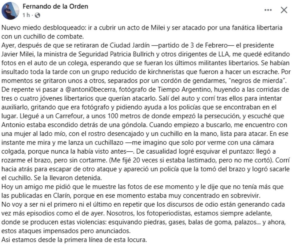 El episodio ocurrió el viernes durante la cobertura del acto de campaña de La Libertad Avanza en Tres de Febrero. La mujer, identificada como Annabel Ilarraz y visiblemente desencajada, roció con gas pimienta, persiguió al fotógrafo de Tiempo, Antonio Becerra, y atacó a otro con un cuchillo de 20 centímetros en un supermercado.