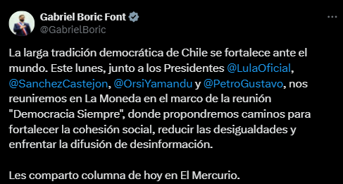 En ese marco, el líder chileno y su par brasileño recibieron al uruguayo Yamandú Orsi, Gustavo Petro de Colombia y el presidente de España, Pedro Sánchez bajo el lema Democracia Siempre.