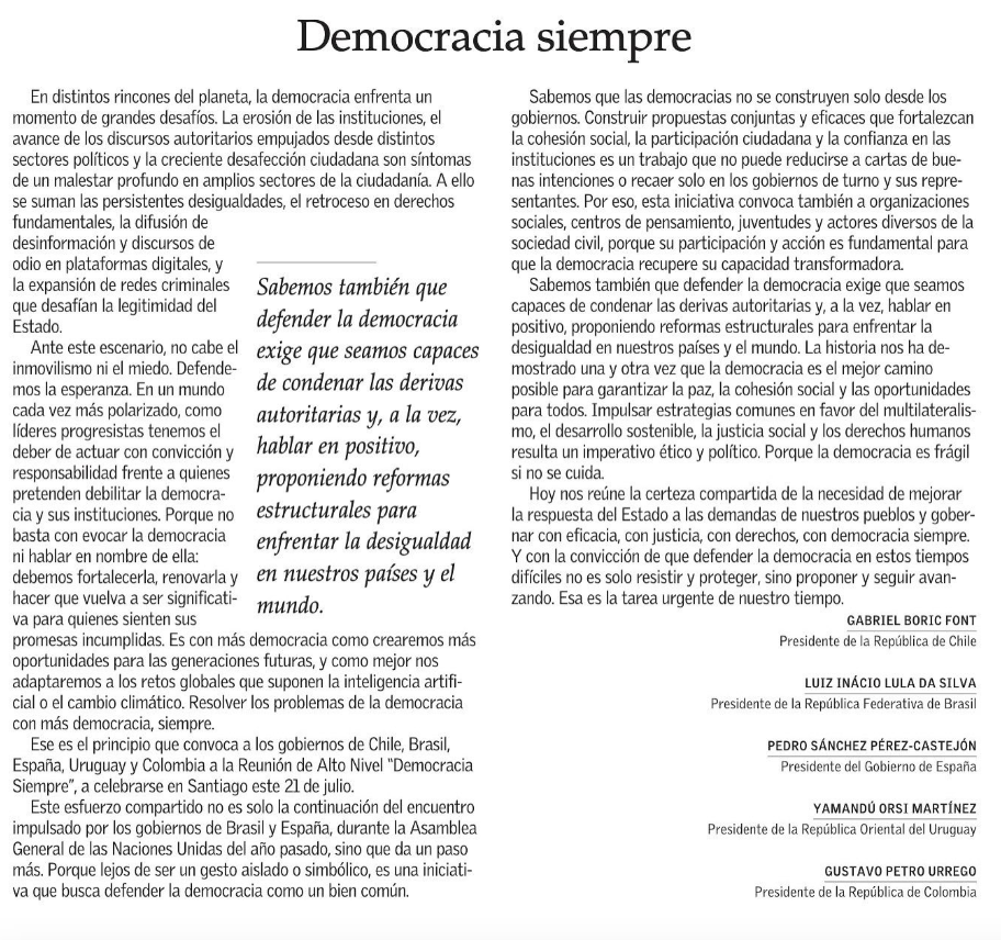En esa línea, los cincos mandatarios progresistas publicaron este domingo por la mañana en el periódico chileno El Mercurio una columna en la que relevaron la necesidad de «condenar las derivas autoritarias» y defender la democracia como una «tarea urgente de nuestro tiempo».