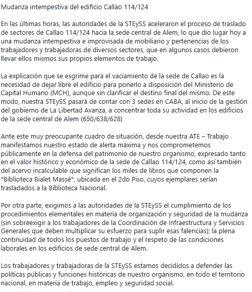 Desde la Asociación Trabajadores del Estado (ATE) denunciaron el inicio de un vaciamiento y la mudanza intempestiva de la sede de la Secretaría de Trabajo sobre la avenida Callao 114/124. Ante la situación, el sindicato declaró alerta máxima en el organismo y señaló que tanto el mobiliario como las pertenencias de Callao se llevaron de manera improvisada a la sede central de Alem 650. En los gremios también marcan preocupación por el golpe de esta medida para el movimiento obrero.