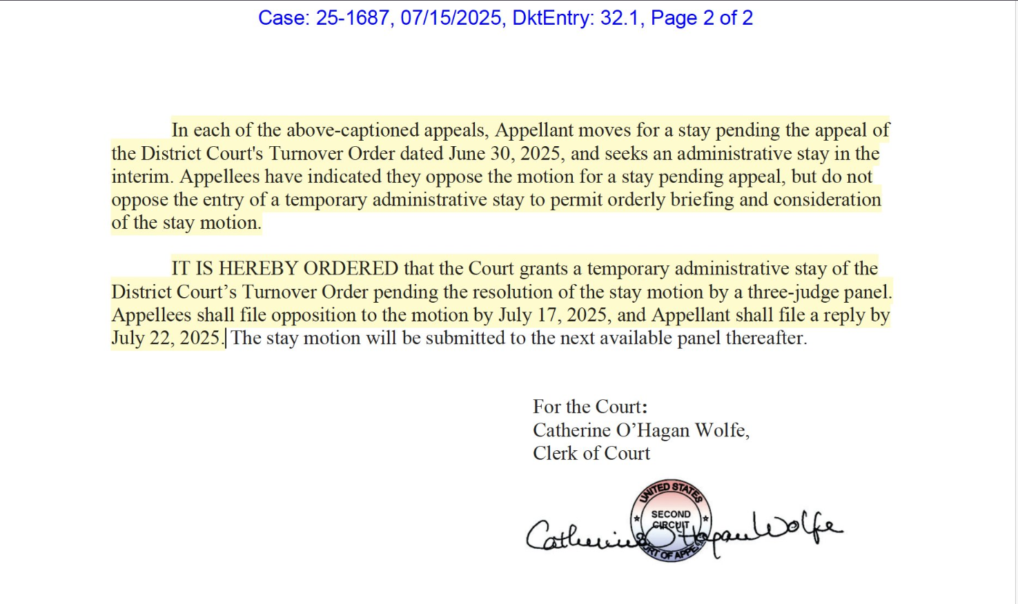 El documento judicial emitido hoy concedió una “suspensión administrativa temporal” (temporary administrative stay) de la “Orden de Entrega” (Turnover Order) que había sido dictada el pasado 30 de junio, consignó la agencia NA.