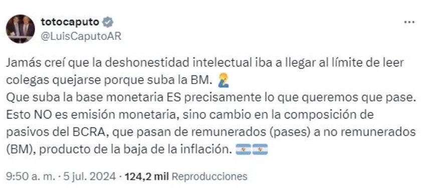 «Jamás creí que la deshonestidad intelectual iba a llegar al límite de leer colegas quejarse porque suba la BM (base monetaria)», señaló el jefe del Palacio de Hacienda en su cuenta de «X». El funcionario remarcó: «Que suba la base monetaria ES precisamente lo que queremos que pase».