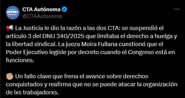 La Justicia le dio un golpe al DNI de Javier Milei que limitaba el derecho a huelga. El Juzgado Nacional del Trabajo N° 3, a cargo de la jueza Moira Fullana, la misma magistrada que días atrás suspendió la eliminación del Día del Trabajador Estatal que había dispuesto el Gobierno a través de otro decreto, hizo lugar este lunes al amparo presentado por la CGT y declaró inconstitucional a los artículos 2 y 3 del Decreto de Necesidad y Urgencia 340/2025 de mayo pasado que imponía restricciones al ejercicio del derecho a huelga en numerosas actividades.