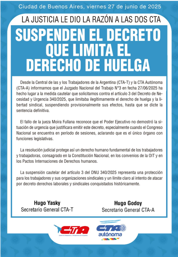 01/07/2025.- www.eldiarioar.com.- Foto portada: Revés para el Gobierno. La Justicia declaró inconstitucional el DNU de Milei que limitaba el derecho a huelga. La jueza Moira Fullana le dio la derecha a la CGT por el DNU que limitaba el derecho a huelga..