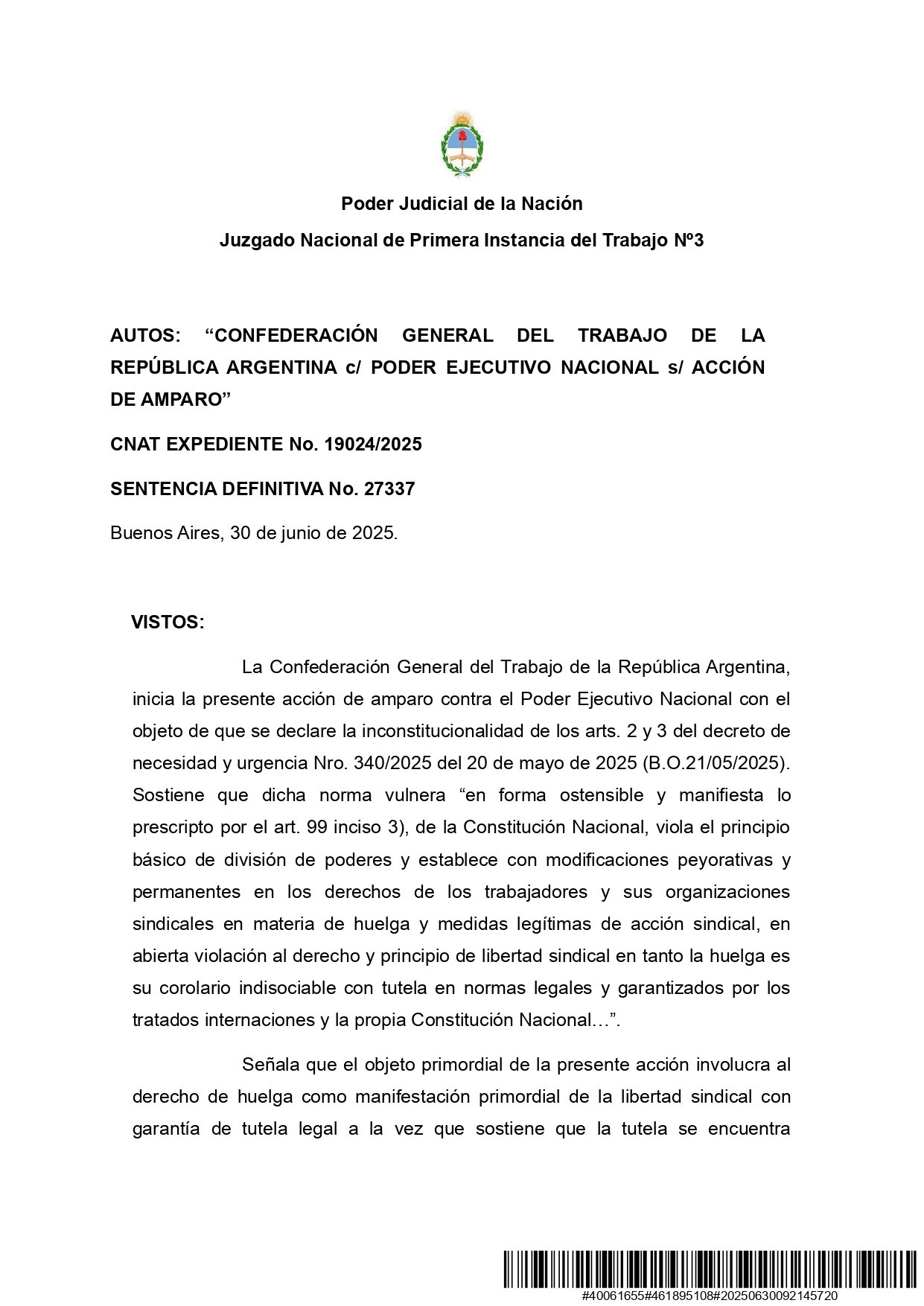 La Justicia le dio un golpe al DNI de Javier Milei que limitaba el derecho a huelga. El Juzgado Nacional del Trabajo N° 3, a cargo de la jueza Moira Fullana, la misma magistrada que días atrás suspendió la eliminación del Día del Trabajador Estatal que había dispuesto el Gobierno a través de otro decreto, hizo lugar este lunes al amparo presentado por la CGT y declaró inconstitucional a los artículos 2 y 3 del Decreto de Necesidad y Urgencia 340/2025 de mayo pasado que imponía restricciones al ejercicio del derecho a huelga en numerosas actividades.