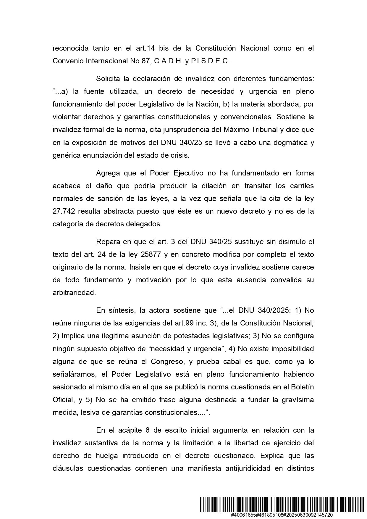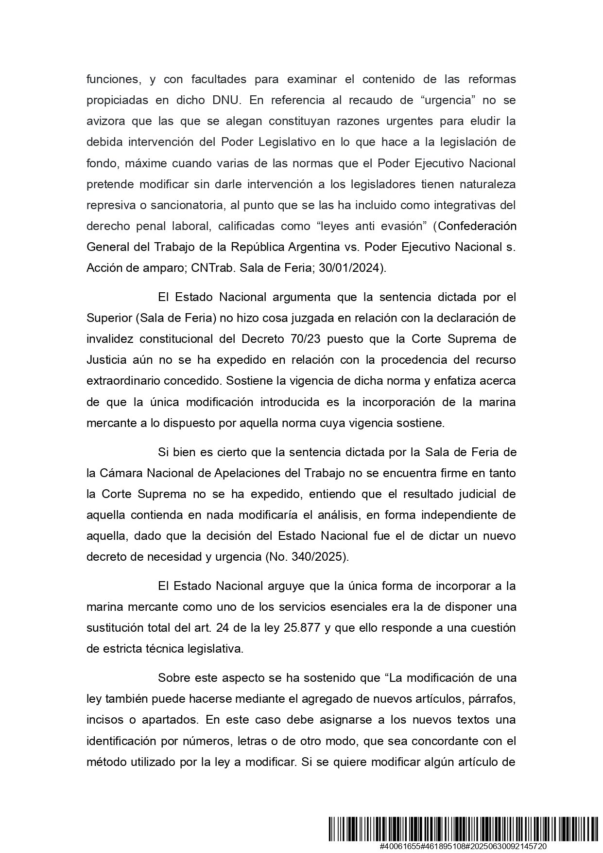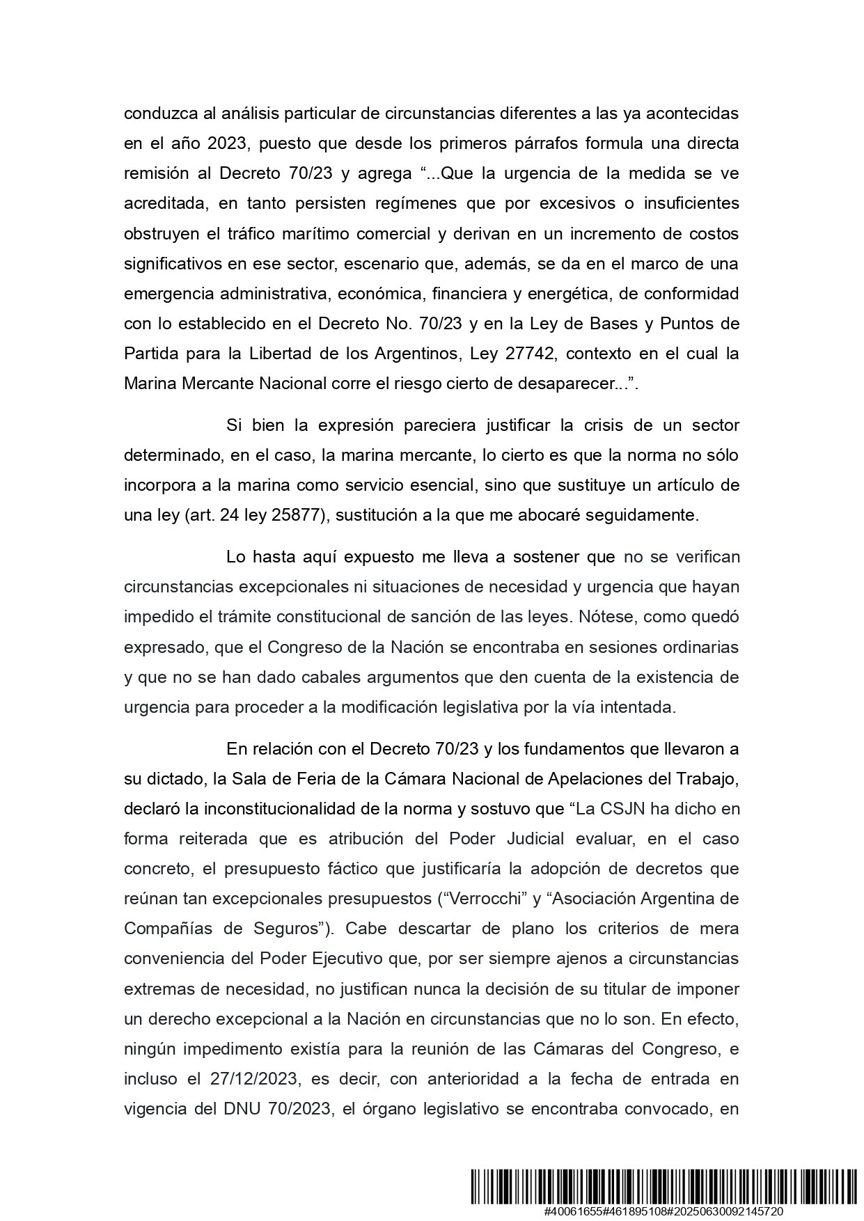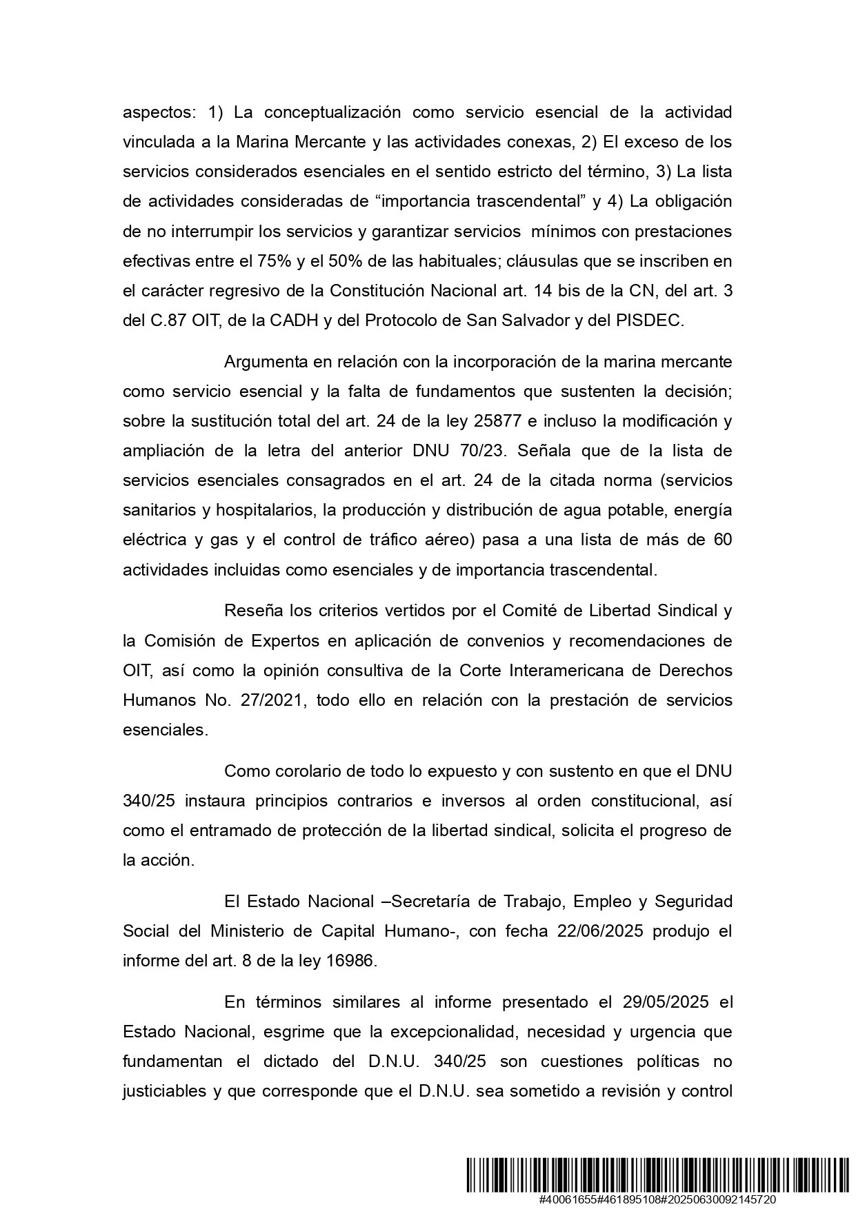 Además, la magistrada también consideró que la norma vulneró la libertad sindical ya que el DNU ampliaba restrictivamente la lista de servicios esenciales, limitando el derecho de huelga en sectores como la marina mercante. La CGT argumentó que esto violaba tratados internacionales (Convenio 87 de la OIT, CADH) y el art. 14 bis de la Constitución, que garantiza la libertad sindical. Además, recordó que la Organización Internacional del Trabajo (OIT) advierte contra definiciones extensivas de “servicios esenciales”, ya que pueden debilitar derechos laborales.