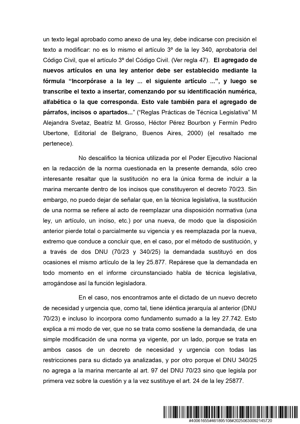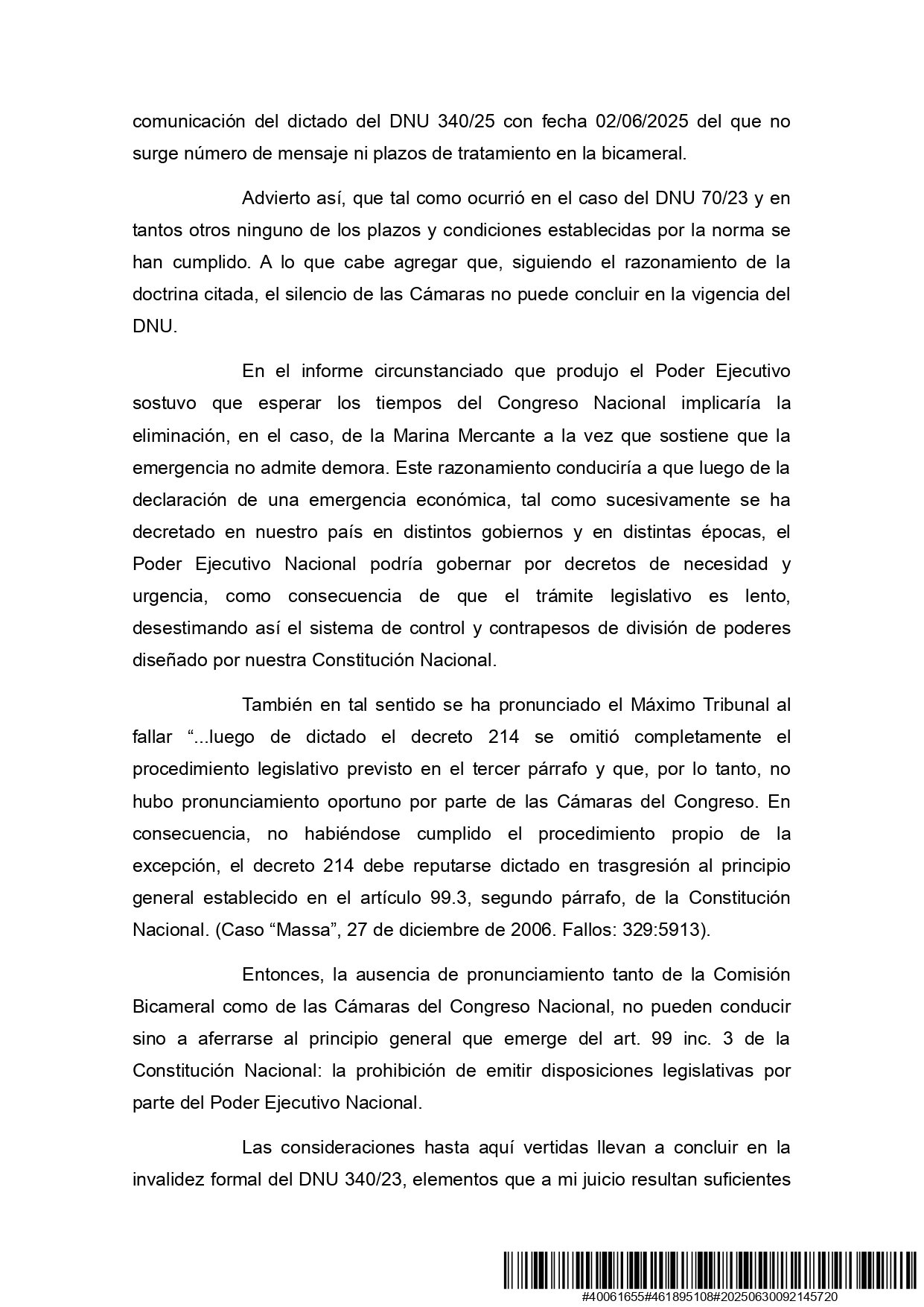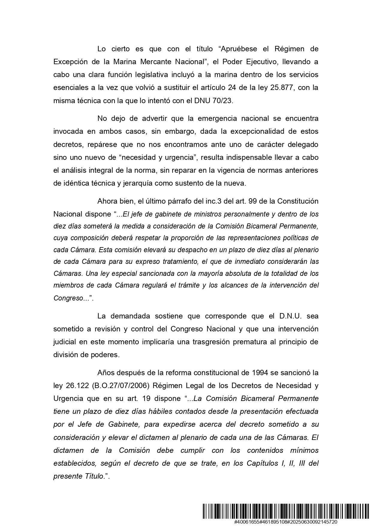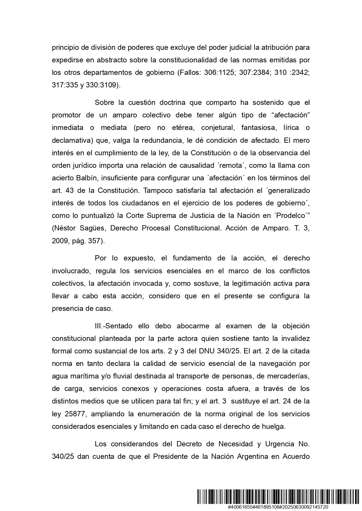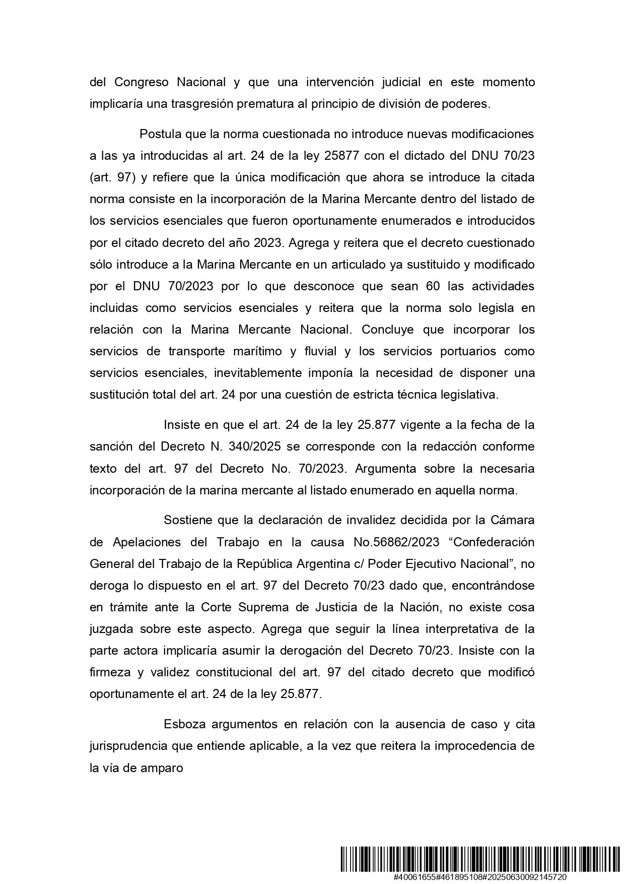 Además, la magistrada también consideró que la norma vulneró la libertad sindical ya que el DNU ampliaba restrictivamente la lista de servicios esenciales, limitando el derecho de huelga en sectores como la marina mercante. La CGT argumentó que esto violaba tratados internacionales (Convenio 87 de la OIT, CADH) y el art. 14 bis de la Constitución, que garantiza la libertad sindical. Además, recordó que la Organización Internacional del Trabajo (OIT) advierte contra definiciones extensivas de “servicios esenciales”, ya que pueden debilitar derechos laborales.