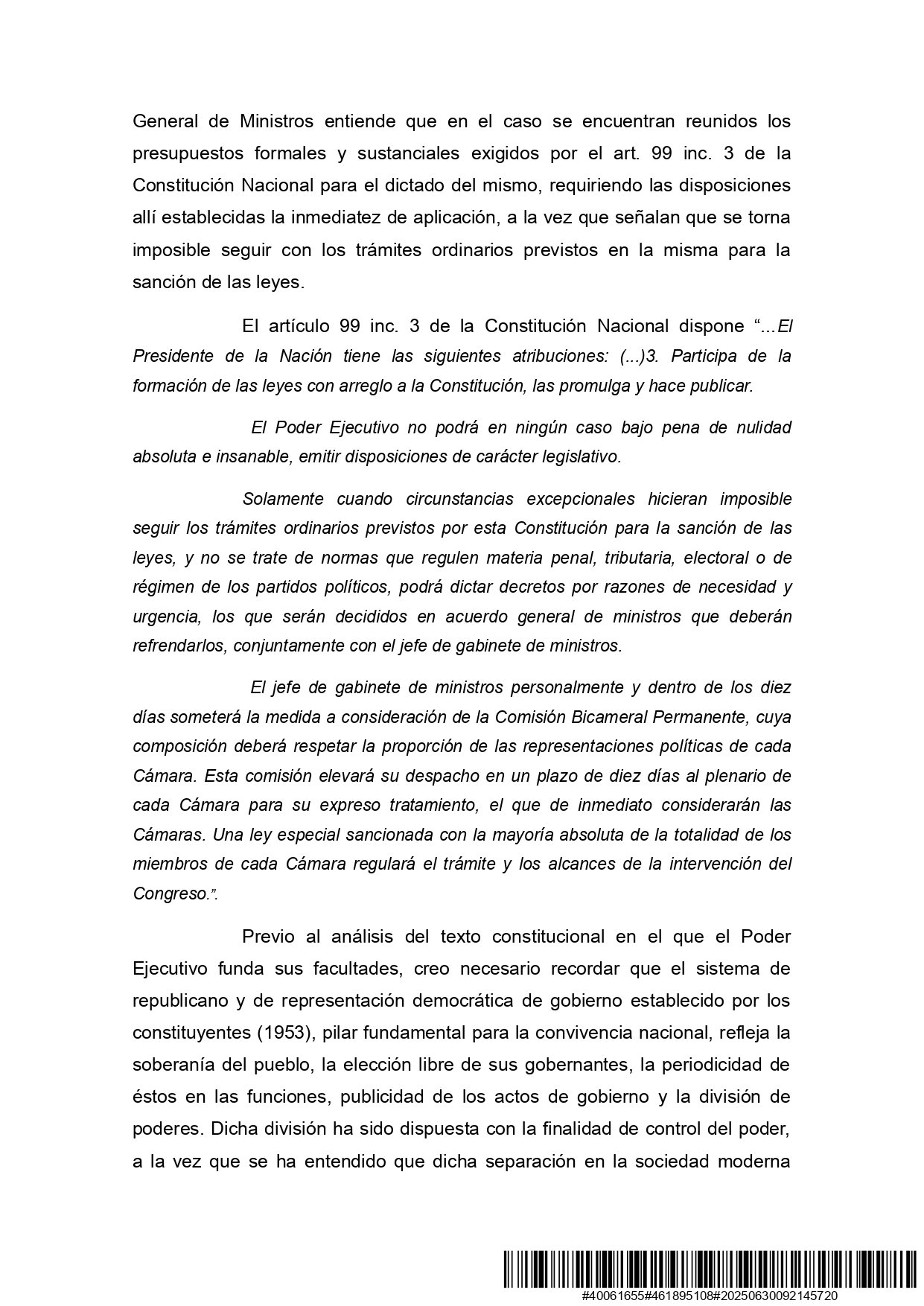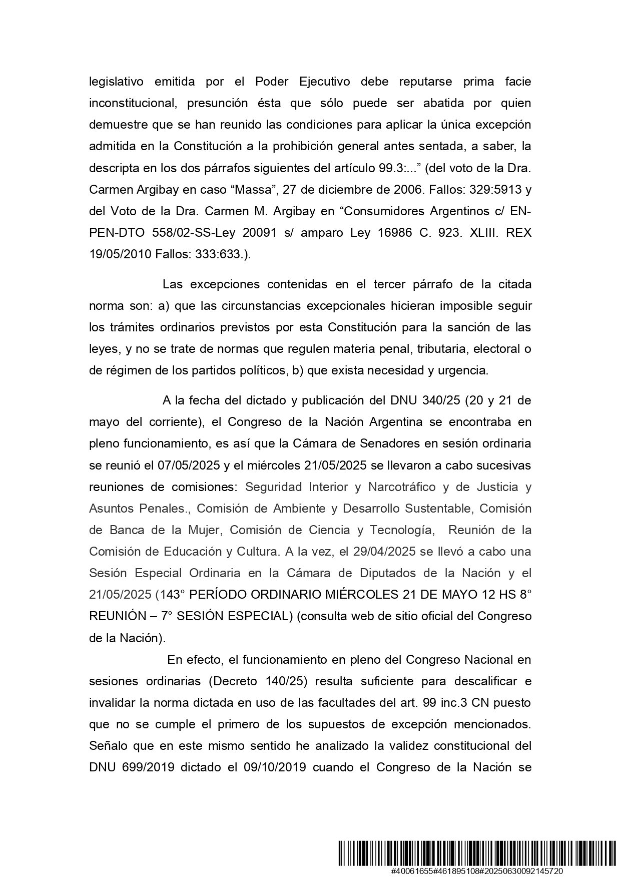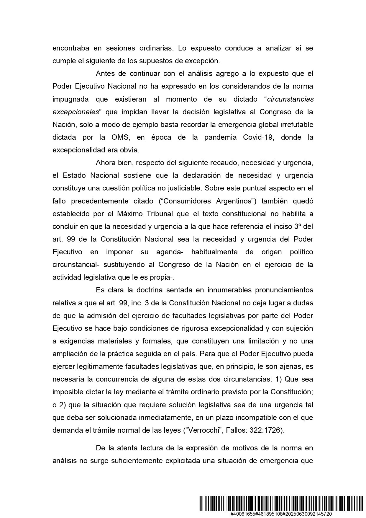 La decisión de la jueza Fullana se basó, por un lado, en la invalidez formal del decreto dado que se dictó mientras el Congreso estaba en pleno funcionamiento, lo que contradice el requisito de “circunstancias excepcionales” exigido por el art. 99, inc. 3 de la Constitución. Además, en esa línea, dijo que el Poder Ejecutivo no justificó suficientemente la “necesidad y urgencia” que habría impedido el trámite legislativo ordinario. Además, el control posterior por parte del Congreso —previsto en la Ley 26.122— no se cumplió, ya que la Comisión Bicameral no emitió dictamen en los plazos legales, consignó el sitio Palabras del Derecho.