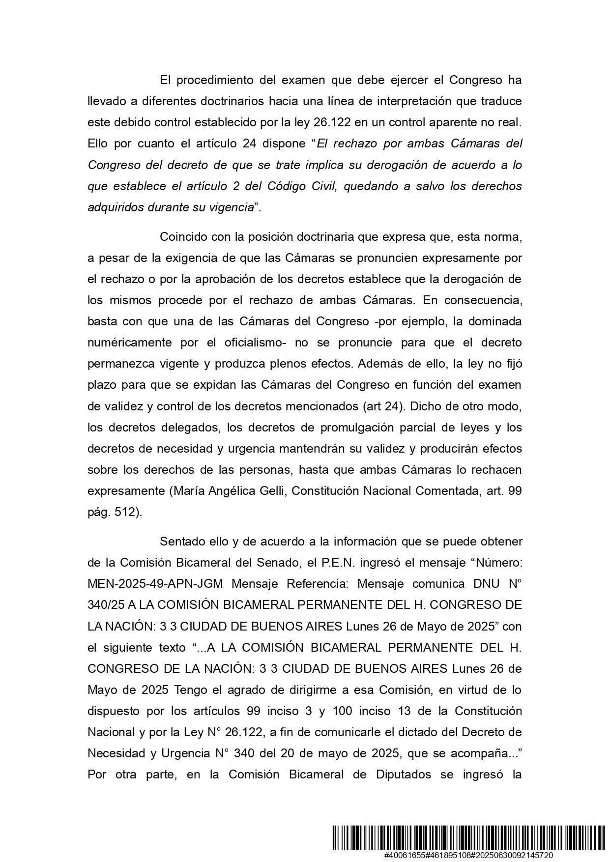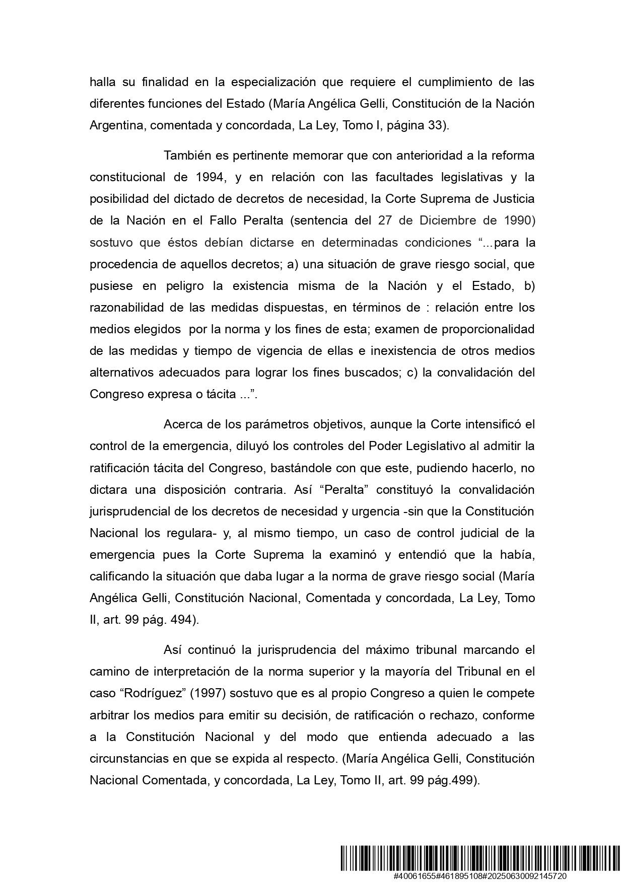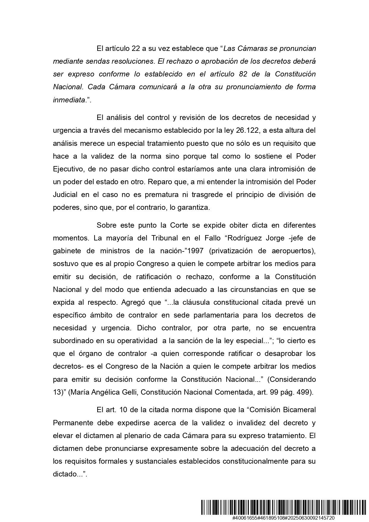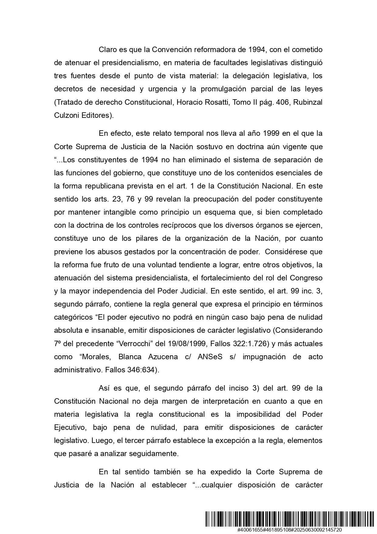 La decisión de la jueza Fullana se basó, por un lado, en la invalidez formal del decreto dado que se dictó mientras el Congreso estaba en pleno funcionamiento, lo que contradice el requisito de “circunstancias excepcionales” exigido por el art. 99, inc. 3 de la Constitución. Además, en esa línea, dijo que el Poder Ejecutivo no justificó suficientemente la “necesidad y urgencia” que habría impedido el trámite legislativo ordinario. Además, el control posterior por parte del Congreso —previsto en la Ley 26.122— no se cumplió, ya que la Comisión Bicameral no emitió dictamen en los plazos legales, consignó el sitio Palabras del Derecho.