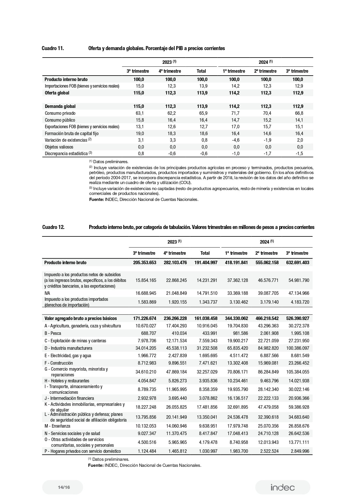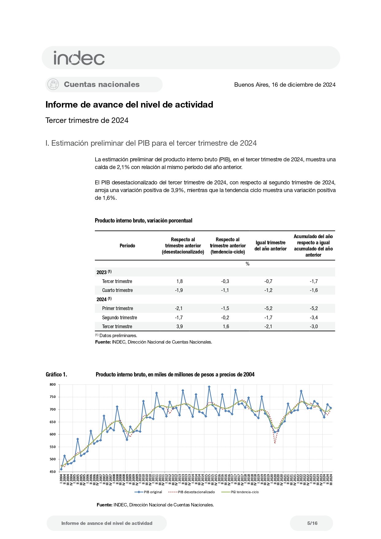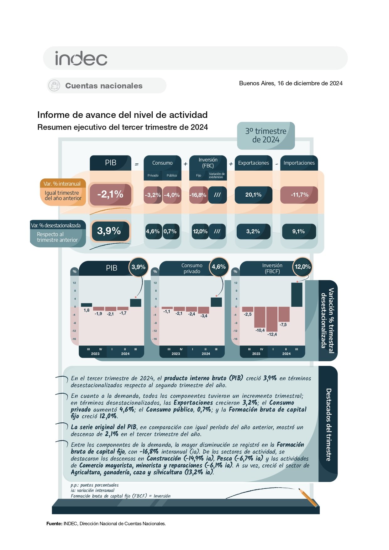En el tercer trimestre de 2024, el primer año de gobierno de Javier Milei, el Producto Bruto Interno (PBI) mostró un repunte del 3,9% respecto del trimestre anterior, pero en comparación con el mismo período de 2023 registró una caída del 2,1%, según el último informe sobre la actividad económica, elaborado y difundido en la tarde de este lunes por el Instituto Nacional de Estadística y Censos (Indec). Este contraste revela un rebote técnico, pero no un cambio estructural en la dinámica económica del país.