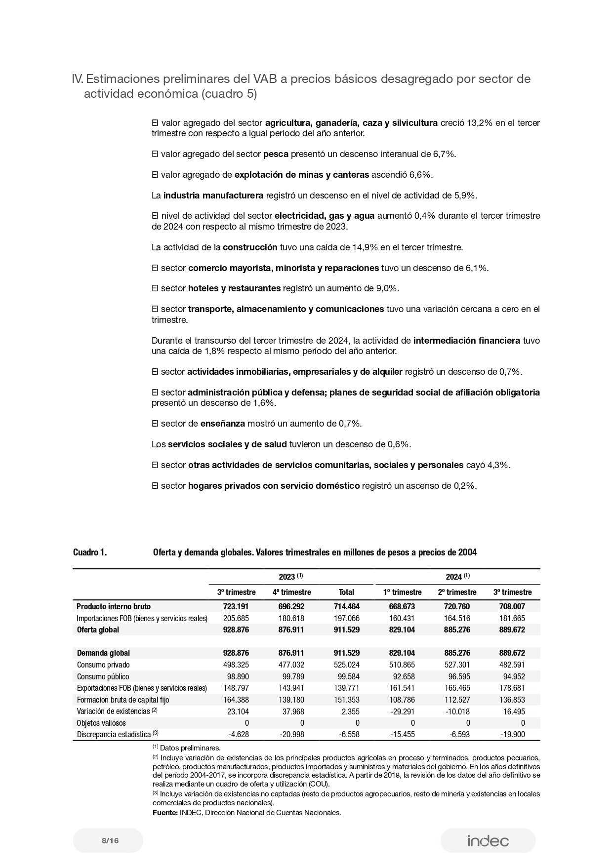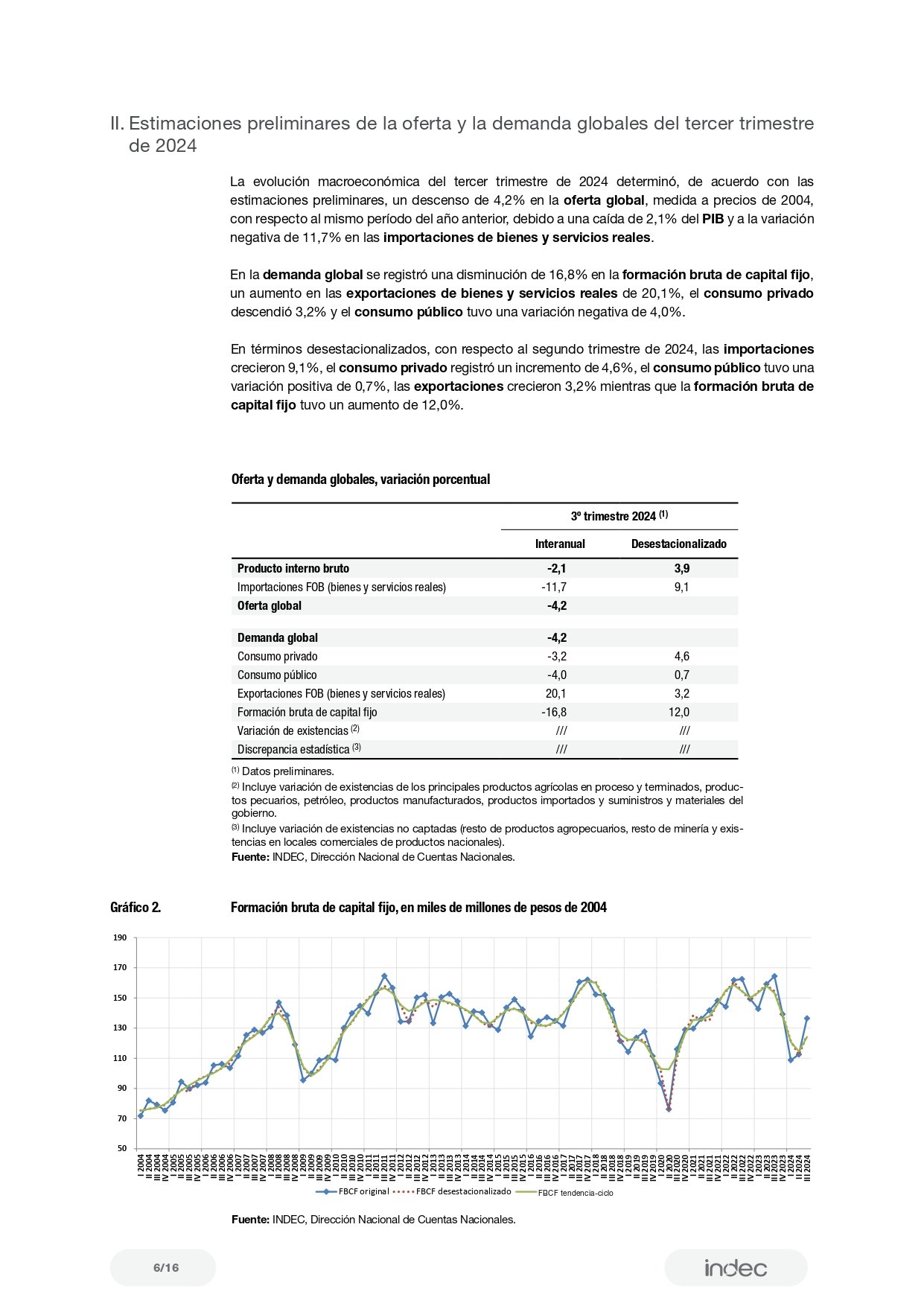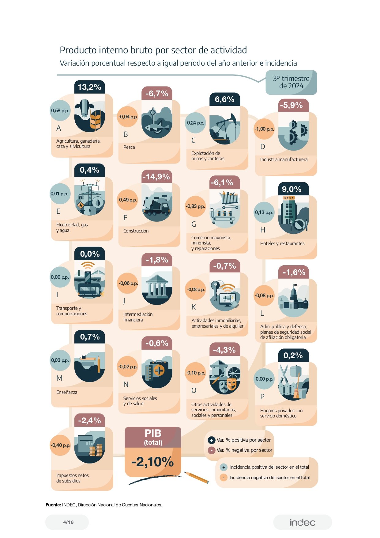 El PBI creció un 3,9% frente al trimestre anterior, pero cayó un 2,1% interanual en el tercer trimestre de 2024. Detrás de los números, la inversión sigue desplomándose y sectores clave, como la construcción, registran caídas pronunciadas.