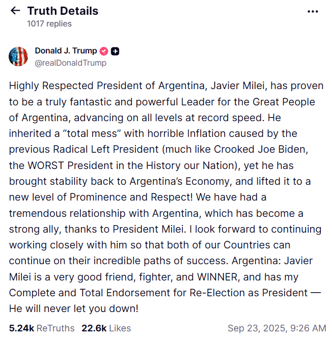 En el texto, precisó: “El muy respetado presidente de Argentina, Javier Milei, ha demostrado ser un líder verdaderamente fantástico y poderoso para el gran pueblo de Argentina, avanzando en todos los niveles a una velocidad récord”.