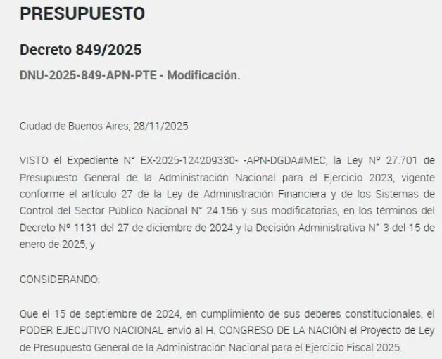 En otro giro marcado por la emergencia económica que el propio oficialismo declara pero no logra contener, el Gobierno dispuso una nueva reestructuración del Presupuesto 2025 —todavía prorrogado desde 2023— para atender gastos corrientes, reforzar partidas sociales y, sobre todo, garantizar el servicio de la deuda pública. El decreto 849/2025, publicado este lunes, argumenta que “sin esta adecuación inmediata, la prestación de servicios esenciales estaría en riesgo”, una frase que ya se volvió habitual en la administración libertaria.
