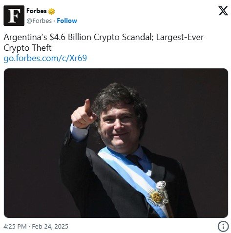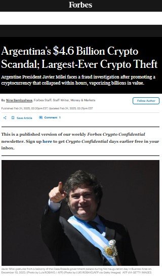 Forbes publicó que el presidente argentino «enfrenta una investigación de fraude luego de promover una criptomoneda que colapsó en cuestión de horas, vaporizando miles de millones en valor».
