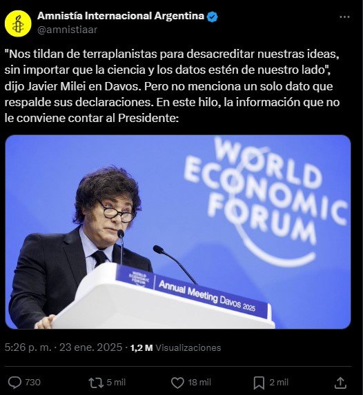 Desde el colectivo Ni Una Menos criticaron su discurso. «Fue una performance global de autoritarismo misógino homo transfóbico que, en conjunto con la amenaza de persecución a lo que él llama´zurdos’, nos pone en una situación de pasaje de umbral en términos de violencia política y habilitación de la violencia en general. Esperamos que el sistema institucional reaccione a la altura», advirtió Luci Cavallero. Según información de La Casa del Encuentro, solo en 2024, hubo 318 víctimas de violencia de género (283 femicidios, 3 lesbicidios, 8 trans/travesticidios y 24 femicidios vinculados de varones). Una víctima cada 27 horas. Amnistía Internacional publicó un extenso racconto de los números que Milei niega. «Las mujeres deben trabajar 8 días y 10 horas más que los varones para ganar lo mismo en un mes», indicaron.