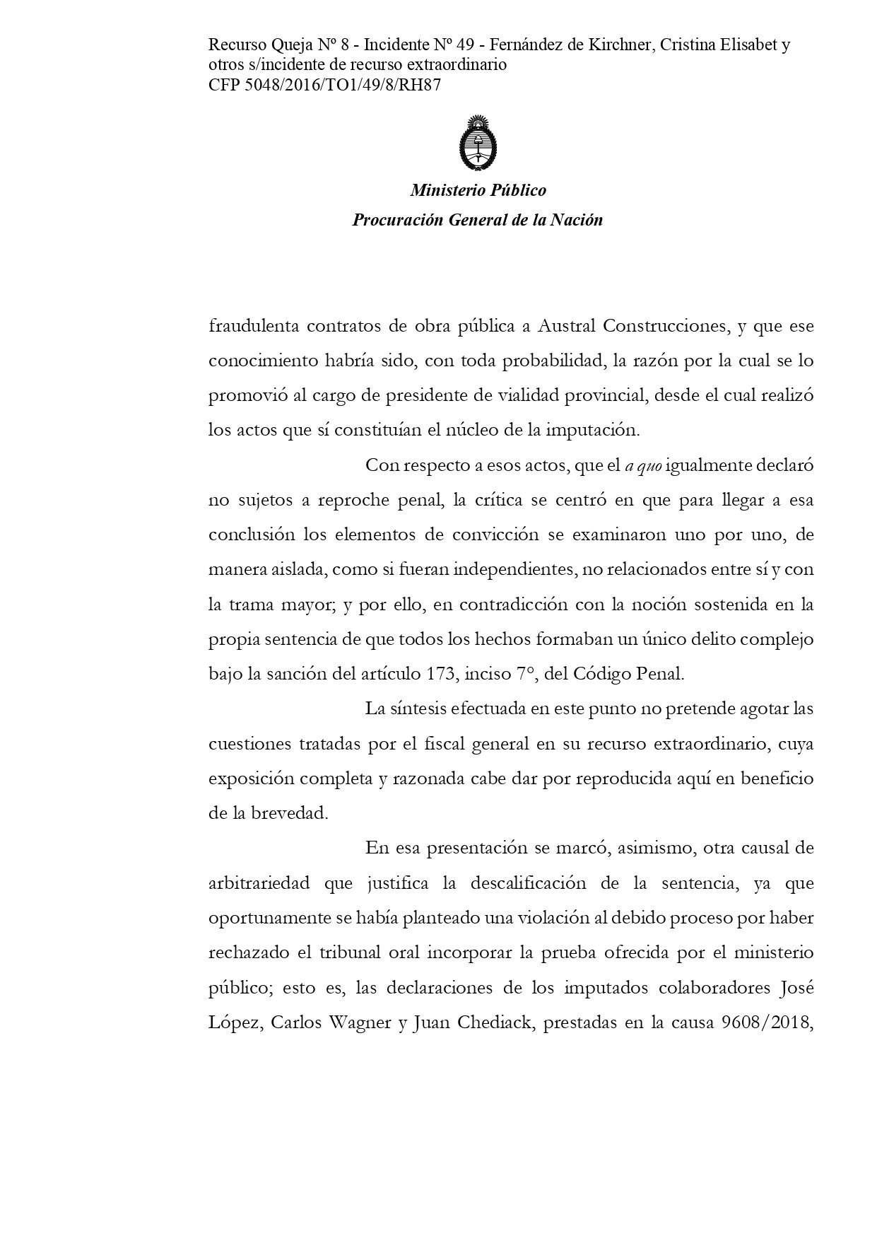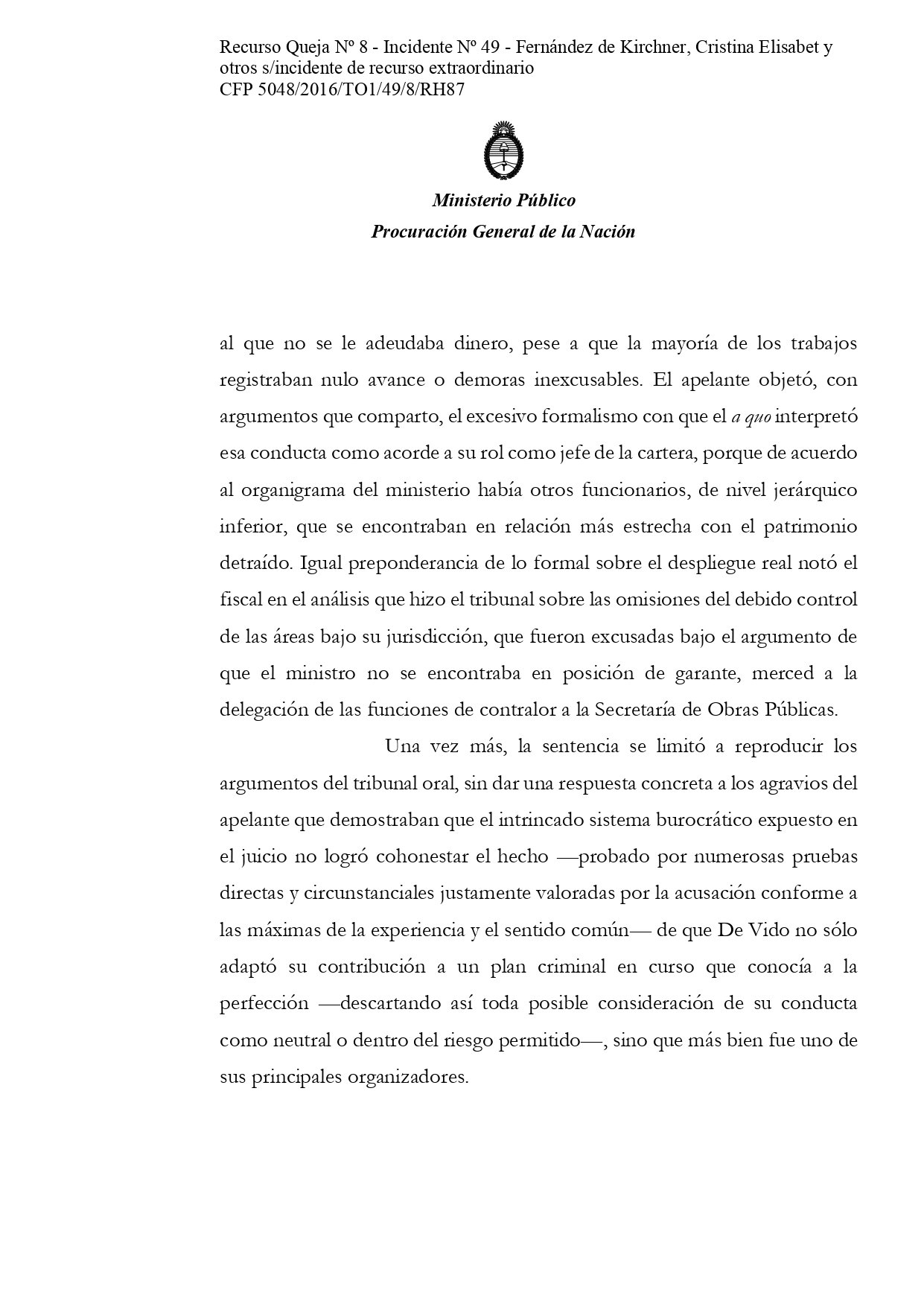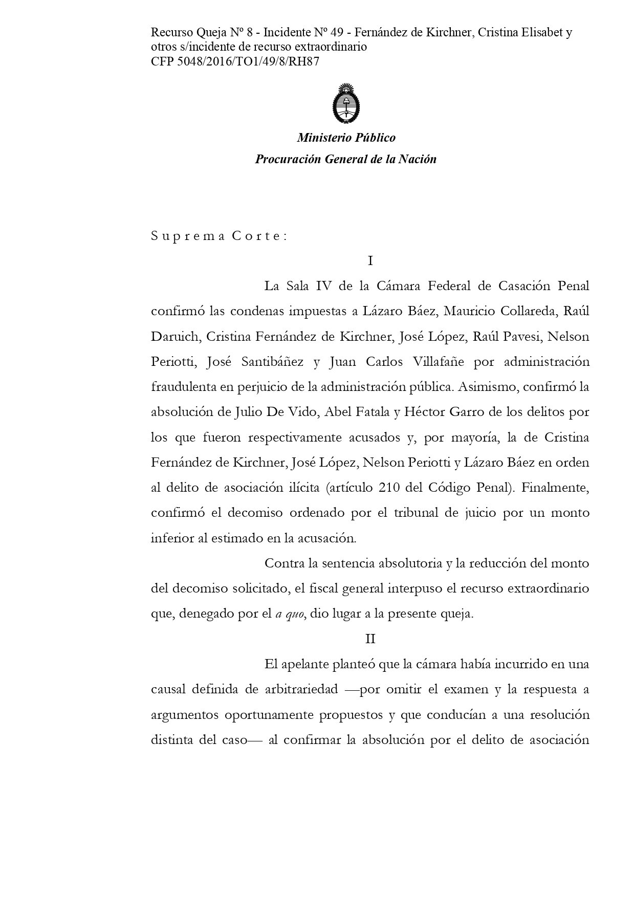 El máximo tribunal simplemente le mandó a Casal un texto de una línea: «Córrase vista a la Procuración General de la Nación», en alusión al recurso de Villar, pero no le envió para que dictamine los planteos de las defensas. Sobre esos no tiene obligación.