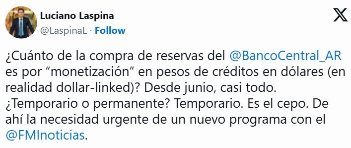 «¿Cuánto de la compra de reservas del @BancoCentral_AR es por «monetización» en pesos de créditos en dólares (en realidad dollar-linked)? Desde junio, casi todo. ¿Temporario o permanente? Temporario. Es el cepo. De ahí la necesidad urgente de un nuevo programa con el @FMInoticias», tuiteó Laspina.
