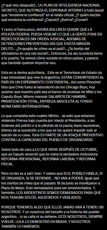 Aún así, la expresidenta advirtió que el plan “no les va a salir bien” llamó a la población a unirse y organizarse para defender sus derechos. “Igual que los cientos de miles que el pasado 18 de junio se movilizaron a Plaza de Mayo. Eran demasiados para ser amedrentados. Y, también, los argentinos somos demasiados para que nos tengan solos, asustados y vigilados”, afirmó.