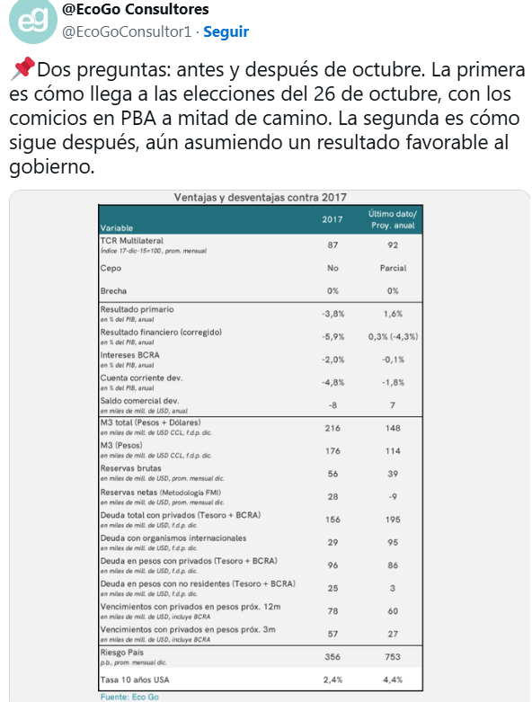 El informe incluyó un interesante cuadro que compara la situación entre la actual gestión y la de Mauricio Macri poco antes de las legislativas de 2017, cuando el equipo económico (del que también formaban parte Luis Caputo y Federico Sturzenegger, integrantes del gabinete y colaboradores íntimos de Milei) no imaginaba la salida de capitales y el vendaval de devaluaciones que se vendría pocos meses más tarde.