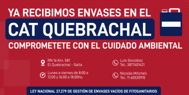 La Secretaría de Ambiente y Desarrollo Sustentable informa que está operativo el nuevo Centro de Almacenamiento Transitorio de El Quebrachal. Con la apertura de este CAT, la Provincia de Salta tiene seis centros en funcionamiento, donde los productores agrícolas pueden entregar los envases cumpliendo con lo establecido por ley.