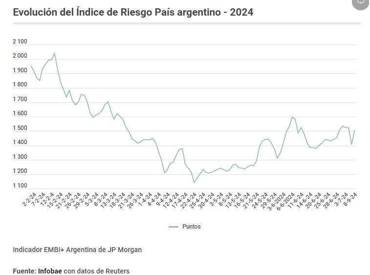 Llamó la atención en las últimas horas la enorme volatilidad que exhibió el riesgo país de Argentina. Sin movimientos perceptibles en la cotización de los bonos soberanos en dólares -que son los considerados para la medición- el riesgo inversor se desplomó más de 100 enteros o un 8% el viernes, para terminar en 1.405 puntos básicos -un mínimo desde el 20 de junio- mientras que este lunes experimenta un salto de similares 100 unidades, para quedar nuevamente sobre los 1.500 puntos.