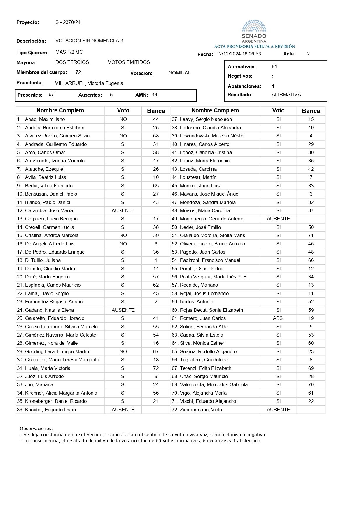En su última intervención, el jefe de la bancada de LLA, Ezequiel Atauche, anunció el acompañamiento a la expulsión. El resultado final: 61 votos a favor, cinco en contra (Maximiliano Abad, Carmen Álverz Rivero, Andrea Marcela Cristina, Alfredo de Ángeli y Enrique Goerling Lara) y dos abstenciones: Juan Carlos Romero y Carlos «Camau» Espínola.