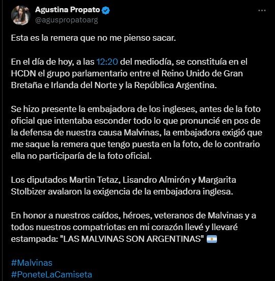 En ese encuentro «se hizo presente la embajadora de los ingleses, antes de la foto oficial que intentaba esconder todo lo que pronuncié en pos de la defensa de nuestra causa Malvinas, la embajadora exigió que me saque la remera que tengo puesta en la foto, de lo contrario ella no participaría de la foto oficial», relató la legisladora en una publicación de X.