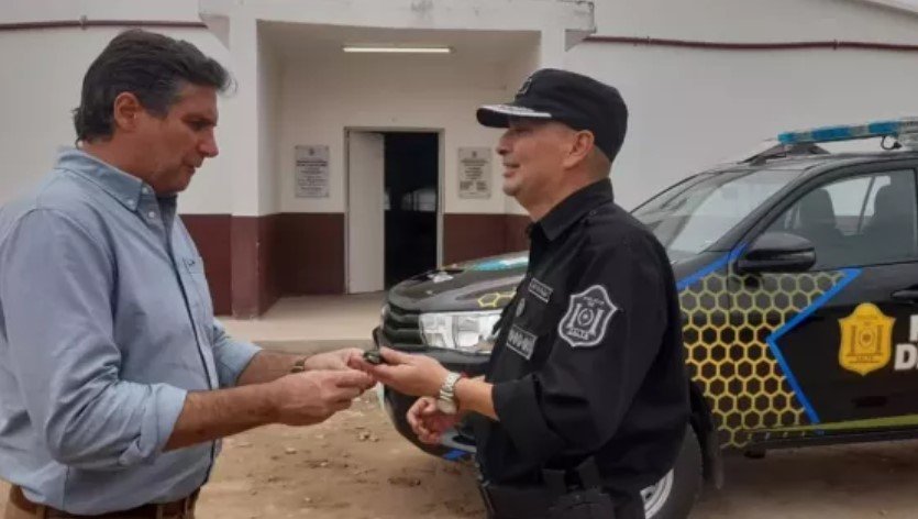 El secretario de Seguridad, Nicolás Avellaneda, y el jefe de la Policía, Diego Bustos, encabezaron en Embarcación el acto de entrega de una camioneta 0 km al Distrito de Prevención 14 en el marco del Plan de Renovación de la Flota Policial.
