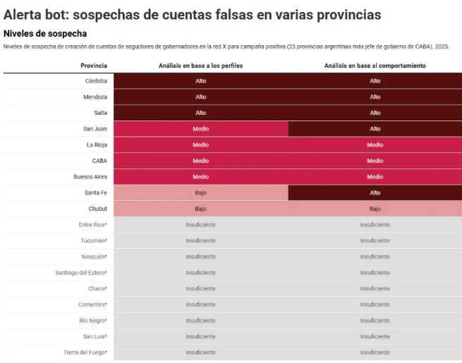 Lo que sí sabe la investigación es que 23 de los 24 gobernadores argentinos tienen un ejército similar de perfiles sospechosos en Instagram, y 15 en la red X, lo que sugiere que la manipulación digital dejó de ser excepción para convertirse en regla en las campañas de poder provinciales.