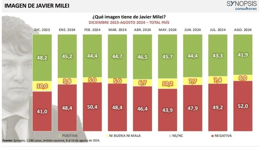 Cuando el libertario asumió en la Presidencia, Synopsis registraba una imagen positiva de Milei del 48,2% y una negativa del 41%. Ahora, casi nueve meses después de ese momento, la imagen del jefe de Estado está en su peor momento: en agosto, la positiva es del 41,9% y la negativa, del 52%.