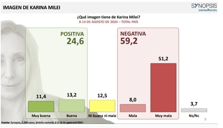 Otro número preocupante para el Gobierno es la imagen sobre la secretaria General de la Presidencia, Karina Milei, clave en la toma de decisiones del ex diputado de la Nación. Solamente un 24,6% tiene una valoración positiva de la funcionaria, mientras un 59,2% tiene una imagen negativa. Un 12,5% aseguró no tener una valoración «ni buena ni mala».