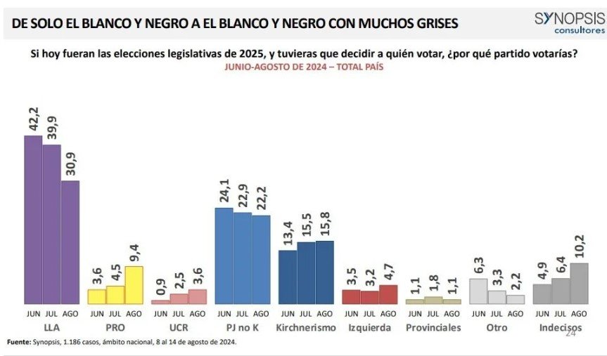 En más de una ocasión, Milei habló sobre la importancia de las elecciones legislativas 2025, que podrían servirles a La Libertad Avanza (LLA) para tener más fuerza en ambas cámaras del Congreso. Sin embargo, el número de eventuales votantes para los comicios también desciende mes a mes: ya lejos quedó el 42,2% de junio, que llegó a un 30,9% en agosto. Mientras, el PRO subió de 3,6% a 9,4%, presumiblemente con votos de LLA. Por otra parte, el kirchnerismo registra un 15,8% y el «peronismo no K», un 22,2%.