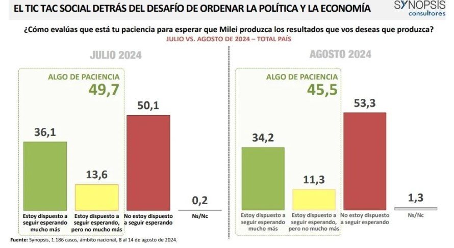 «¿Cómo evaluás que está tu paciencia para esperar que Milei produzca los resultados que vos deseás que produzca?», fue otra de las preguntas de la encuesta. Allí, el 53,3% aseguró no estar dispuesto a seguir esperando; el 45,5% respondió tener «algo de paciencia».