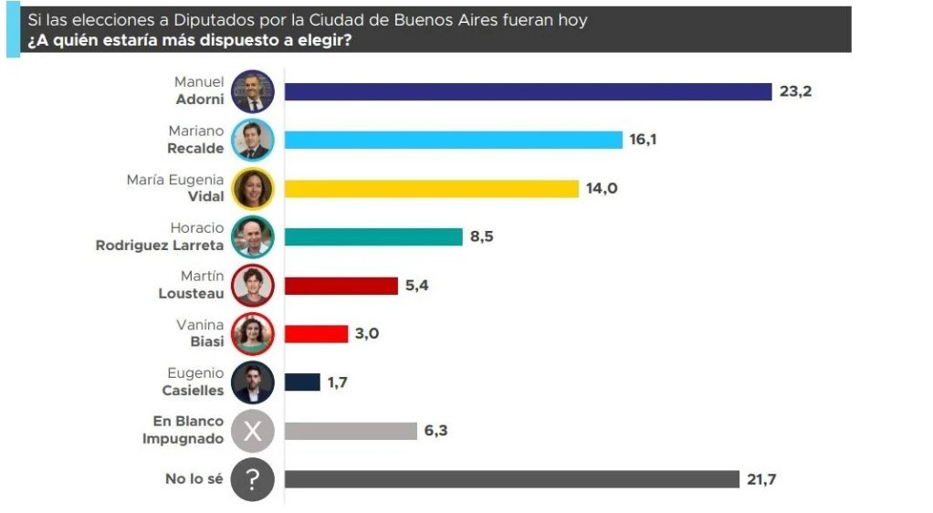 En una parte, se preguntó a quiénes votarían los encuestados en caso de que las elecciones a diputados nacionales por la Ciudad fueran ahora: allí, Mauricio Macri quedó primero, con el 24,2%; segundo apareció Leandro Santoro, con el 22,3%, menos de dos puntos por debajo del ex presidente, y en tercer lugar fue elegido Manuel Adorni, con el 15,6%. Cuarto quedó el ex jefe de Gobierno porteño, Horacio Rodríguez Larreta, con el 6%.