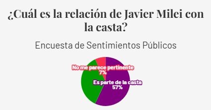 Sin embargo, las opiniones varían notablemente según la región y el nivel socioeconómico. En la Ciudad de Buenos Aires (CABA) y en los sectores de niveles socioeconómicos altos, la percepción de Milei como parte de la «casta» es más pronunciada, mientras que en el resto del país esta cifra se reduce al 50%.