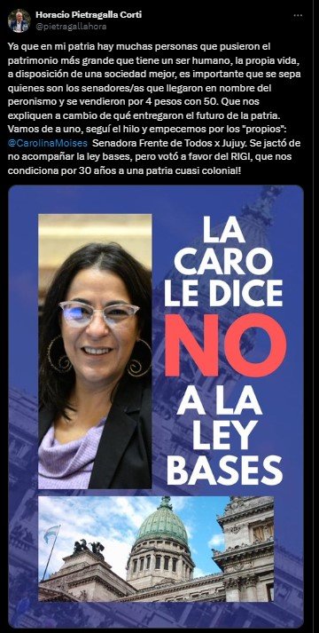 Quien salió a jugar fuerte fue el ex Secretario de Derechos Humanos de la Nación, Horacio Pietragalla. A través de un hilo de Twitter, apuntó contra el senador catamarqueño Guillermo Eduardo Andrada, la tucumana Sandra Mendoza y la salteña Carolina Moisés, quienes si bien votaron en contra del proyecto en general, lo hicieron a favor del RIGI, que llegó al recinto con algunas pocas modificaciones de último momento que introdujo el oficialismo.